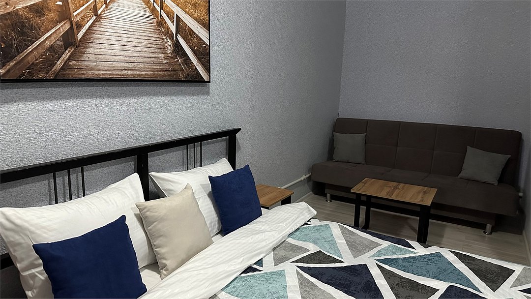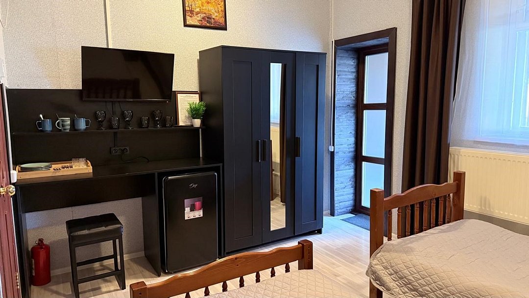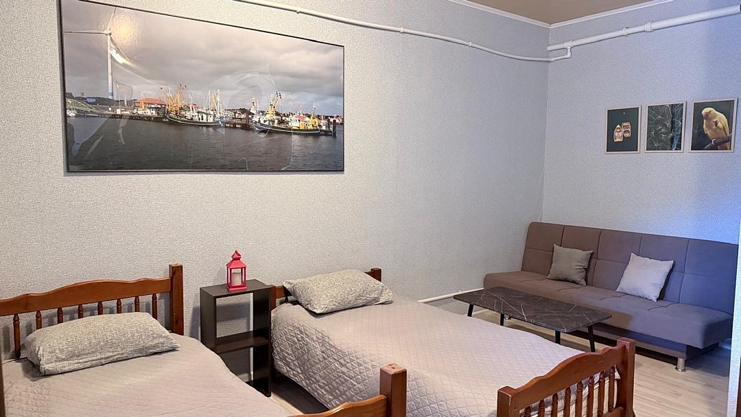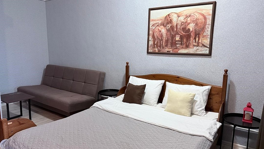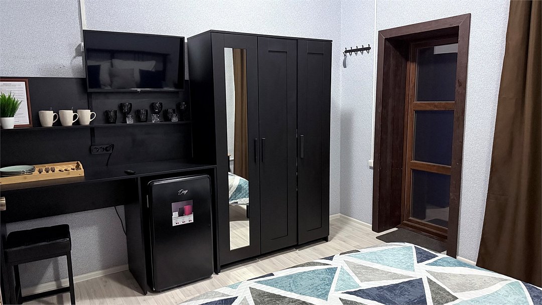 Здесь есть всё необходимое для комфортного проживания: два отдельных спальных места, уютный диванчик, кондиционер, телевизор, Wi-Fi, мини-холодильник, набор красивой посуды, полотенца, косметика и фен.