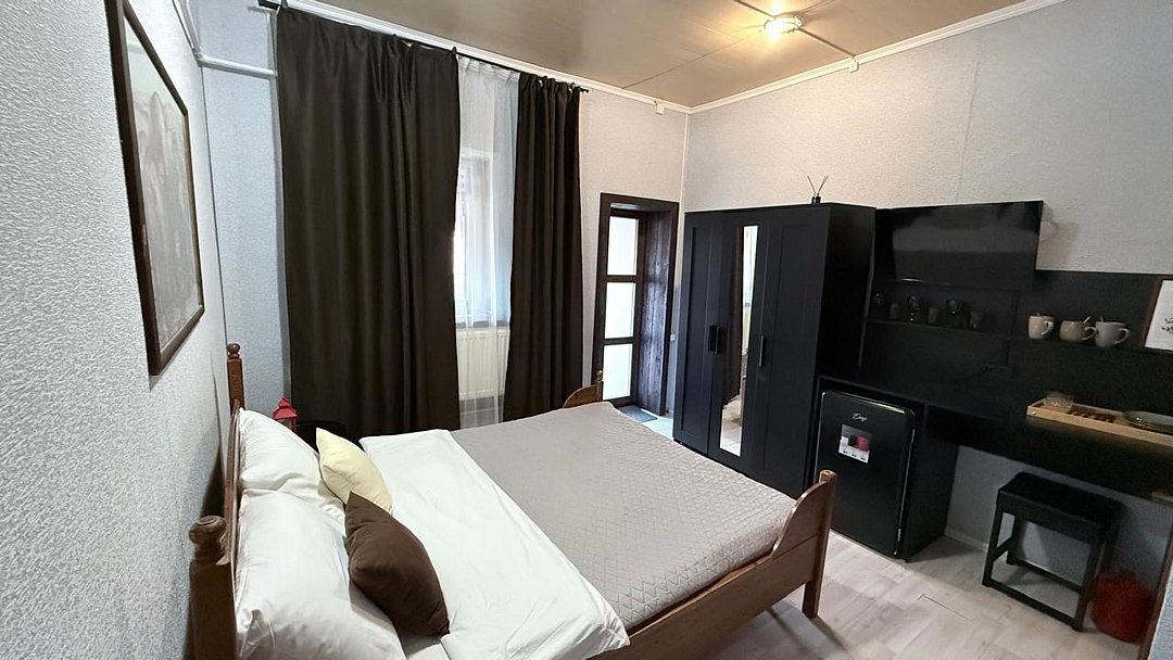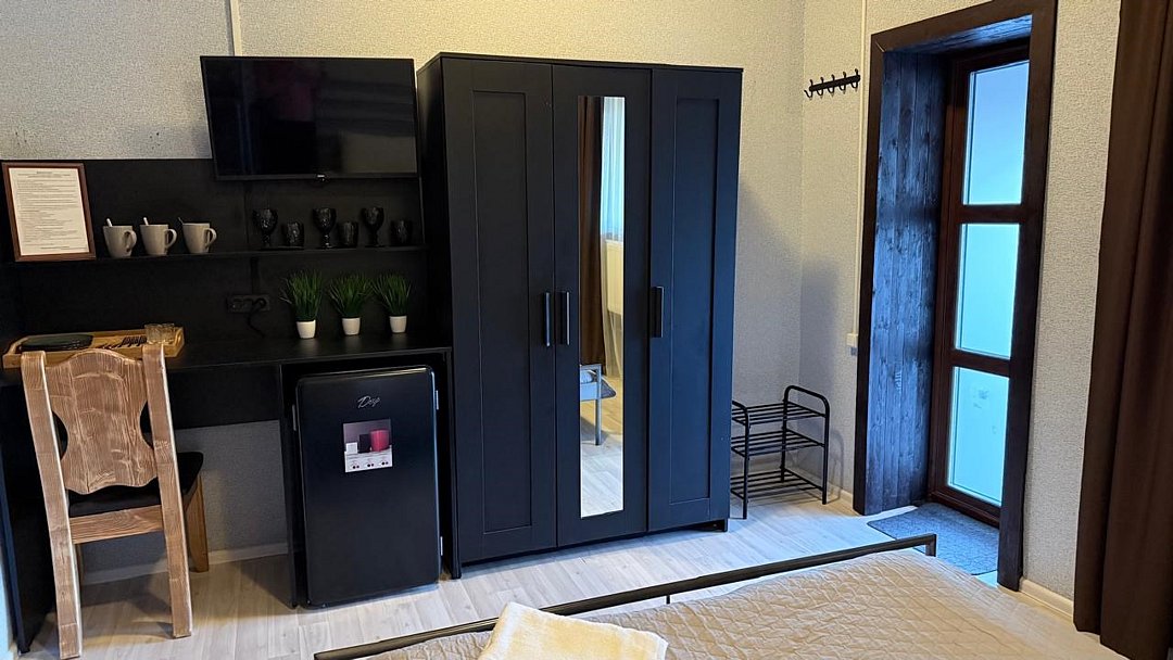 В номере «Доверие» есть всё необходимое для полноценного отдыха: двуспальная кровать, уютный диванчик, кондиционер, телевизор, Wi-Fi, мини-холодильник, набор красивой посуды, полотенца, косметика и фен.