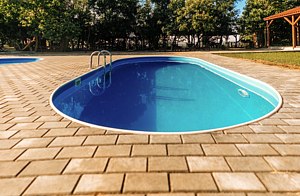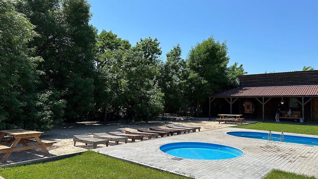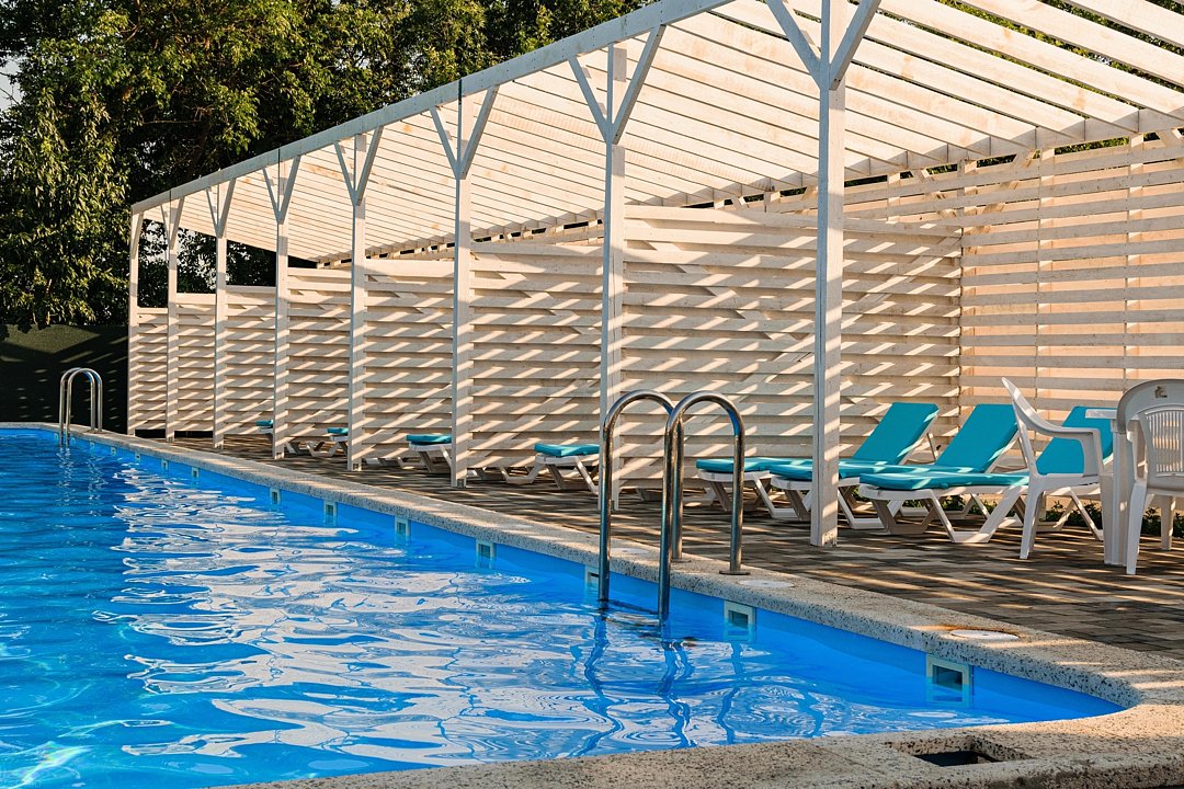 Большой бассейн с зоной отдыха. Работает с мая по сентябрь.