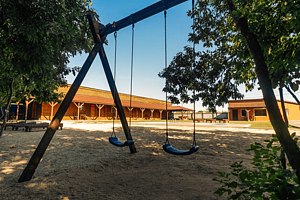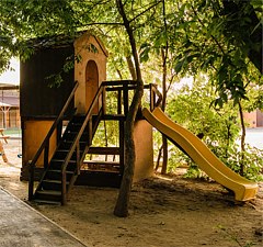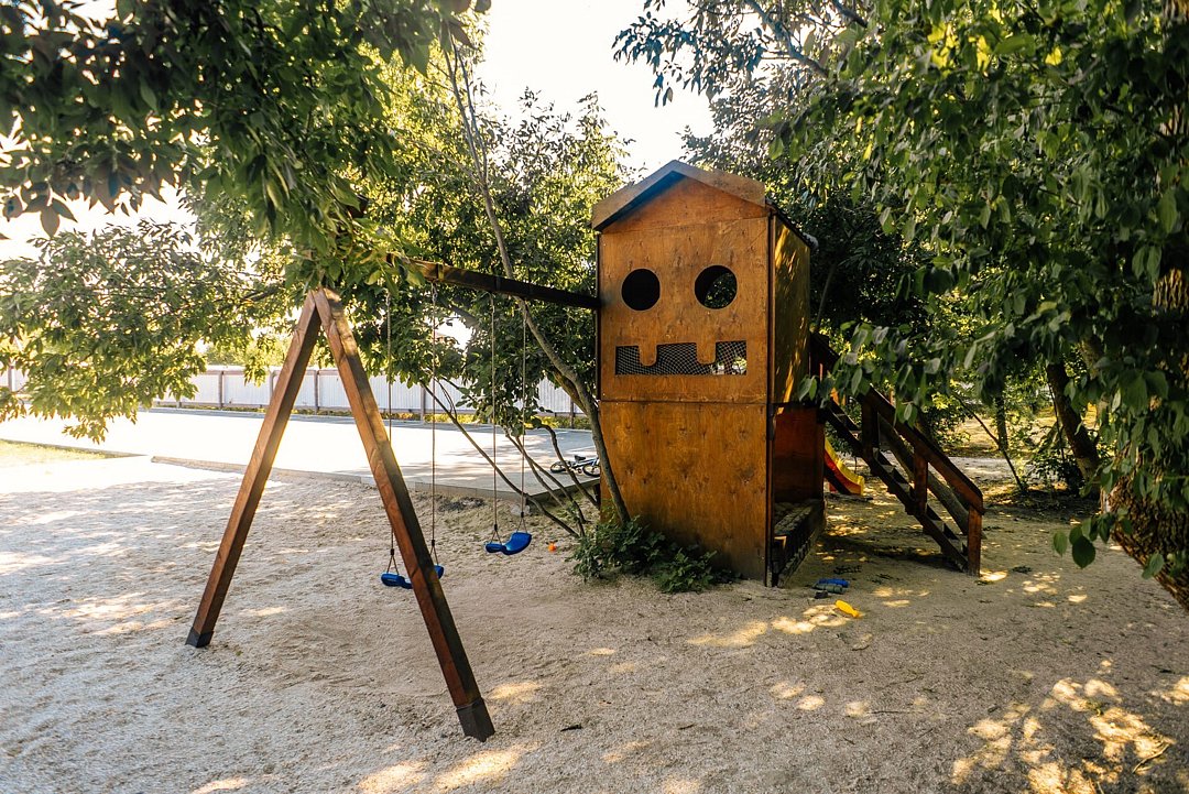 Есть детский игровой домик с песочницей и горкой, где вашим детям точно не будет скучно. Он расположен в тени деревьев, что обеспечивает защиту от солнца в жаркие дни.