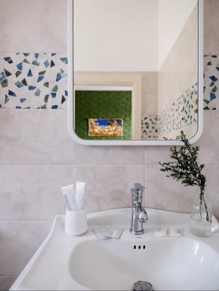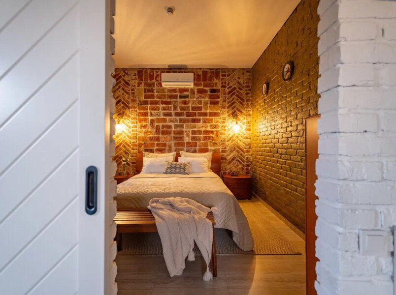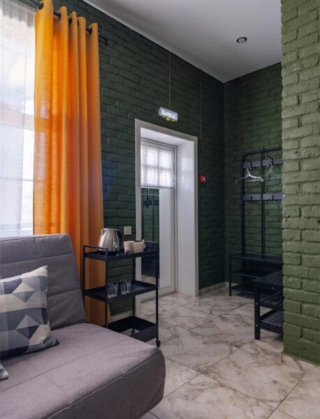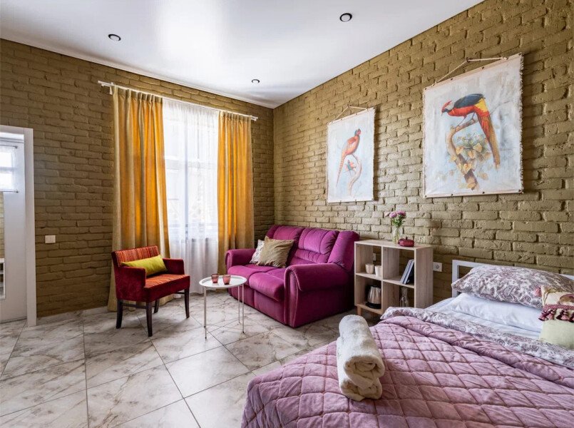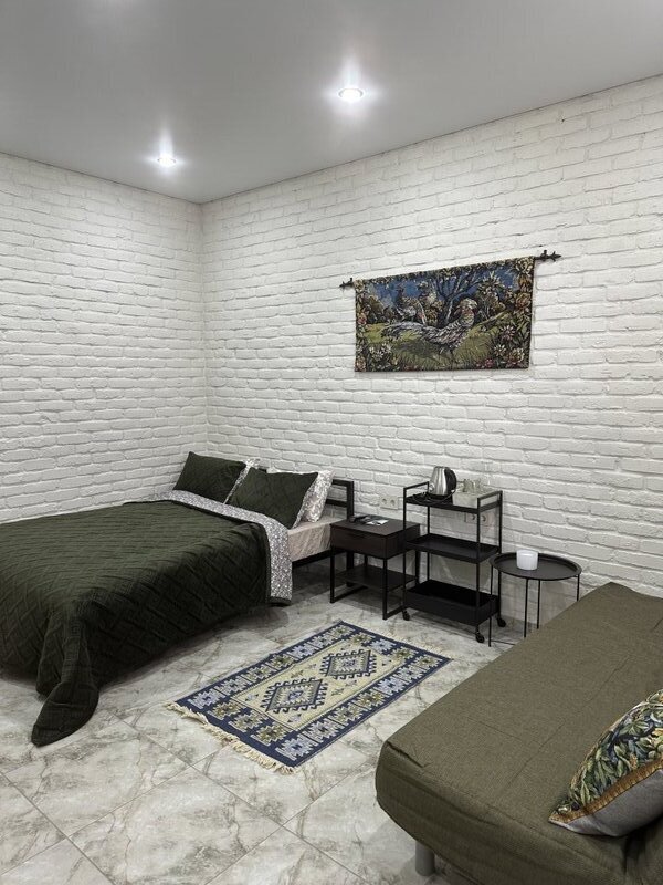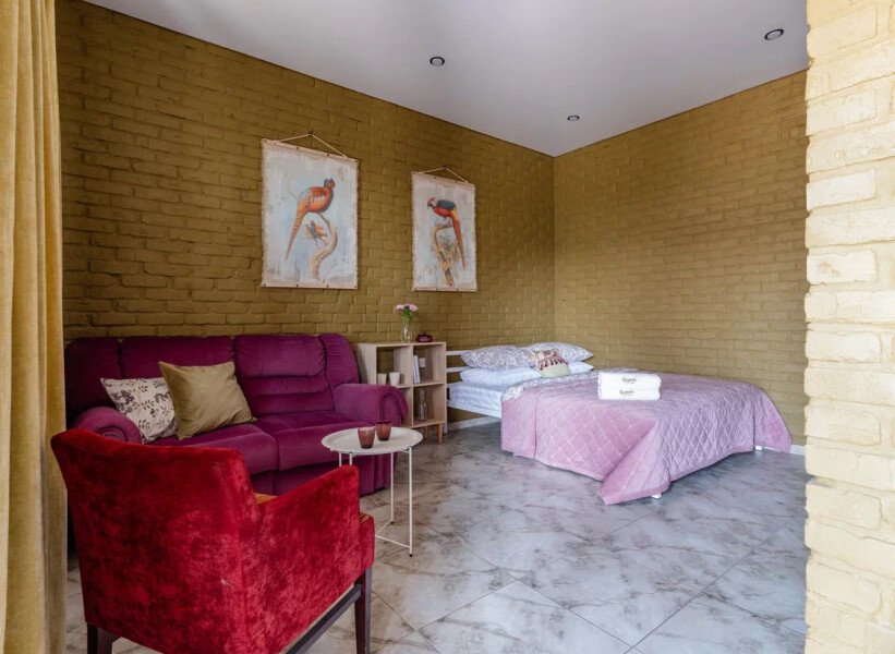 Идеален для проживания 2-х взрослых и 1 ребенка. В номере кровать, журнальный столик, диван и открытый гардероб, стаканы, кружки. Бытовая техника — телевизор, чайник, кондиционер, Wi-Fi. В ванной комнате есть косметический набор и комплект полотенец.