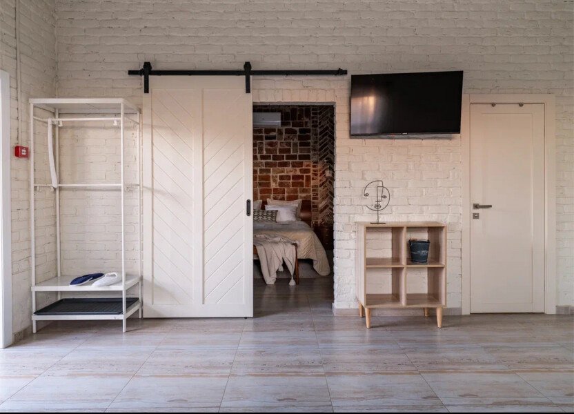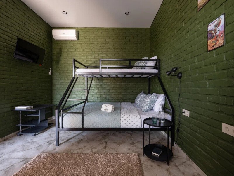 Идеален для проживания 2-х взрослых и 2-х детей. В номере кровать, журнальный столик, диван и открытый гардероб, стаканы, кружки. Бытовая техника — телевизор, чайник, кондиционер, Wi-Fi. В ванной комнате есть косметический набор и комплект полотенец.