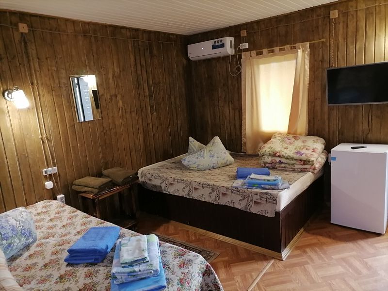 Домик рассчитан на 4-5 человек. В номере две двуспальные кровати, цифровое ТВ (телеканал Карусель в пакете), холодильник, кондиционер, чайник. Удобства в номере.
