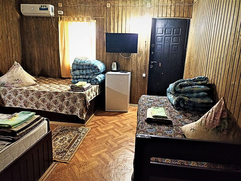 Домик рассчитан на 4-5 человек. В номере кондиционер, две двуспальные кровати, цифровое ТВ (телеканал Карусель в пакете), холодильник, чайник. Удобства в номере. Парковка возле домика.