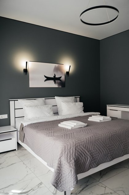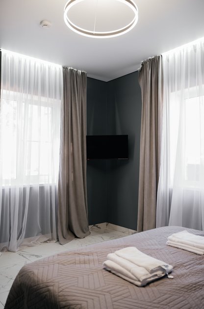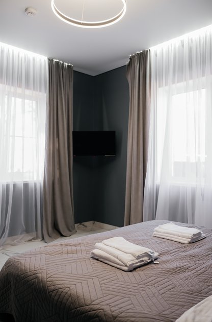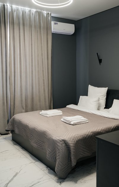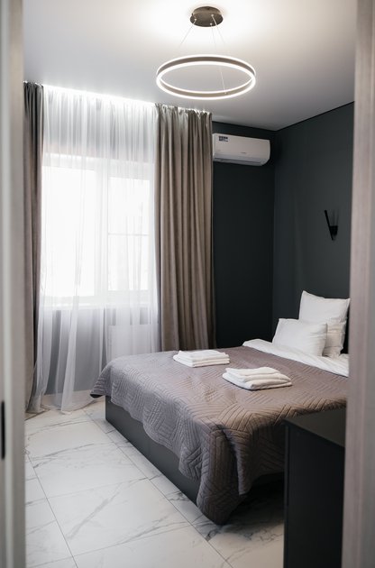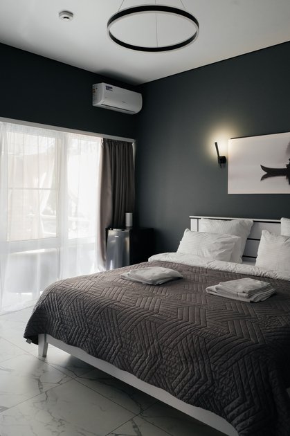 В однокомнатном номере вы найдете все для вашего удобства: кровать king-size с ортопедическим матрасом, холодильник, чайник, микроволновую печь, чайный и кофейный набор. Постельное белье премиум-качества, полотенца, ванные принадлежности, тапочки, фен. Телевизор Яндекс тв, wi-fi, кондиционер. У каждого номера своя большая терраса с садовой мебелью и мангальная зона.