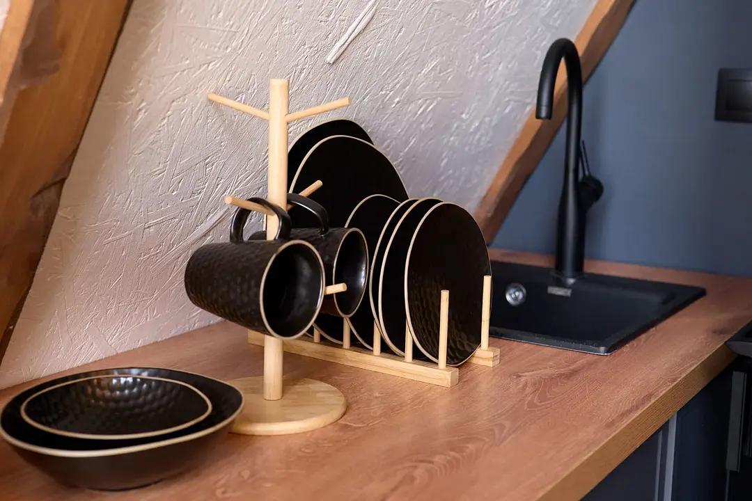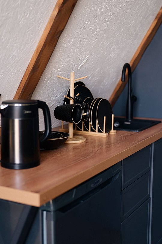 В доме небольшая кухня с раковиной и холодильником. Также для вас в доме есть необходимая посуда, чай, кофе, сахар, тапочки и средства личной гигиены. Телевизор и Wi-fi.