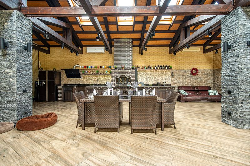 База отдыха приглашает вас насладиться атмосферой истинного комфорта и умиротворения в уютной зоне отдыха на закрытой террасе. Пространство с панорамными окнами, мягкими диванами и обеденным столом создает ощущение уюта и релакса. Здесь вы можете с удовольствием провести время за приятной беседой, наслаждаясь мерцанием камина и плавными ритмами музыки.