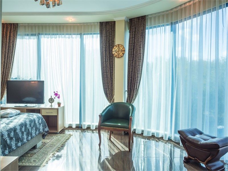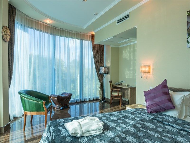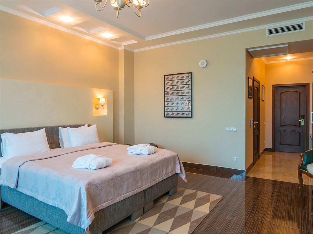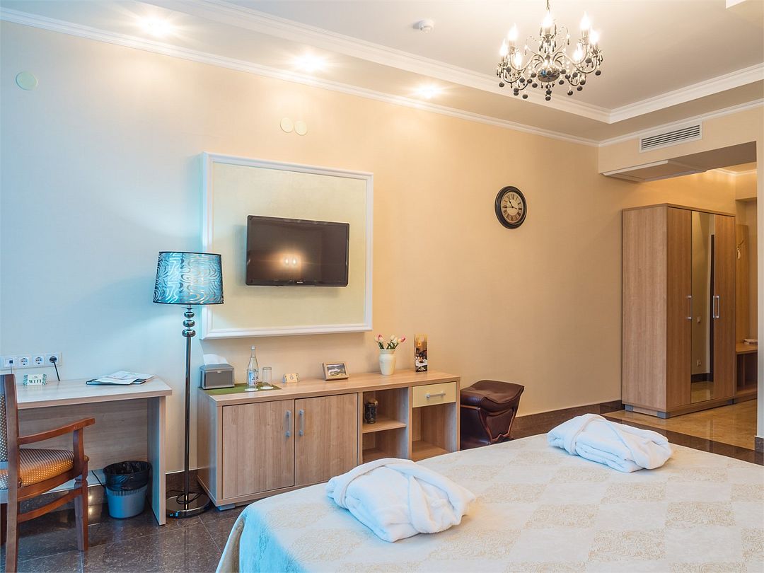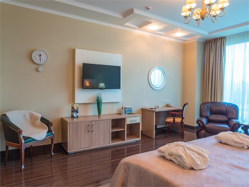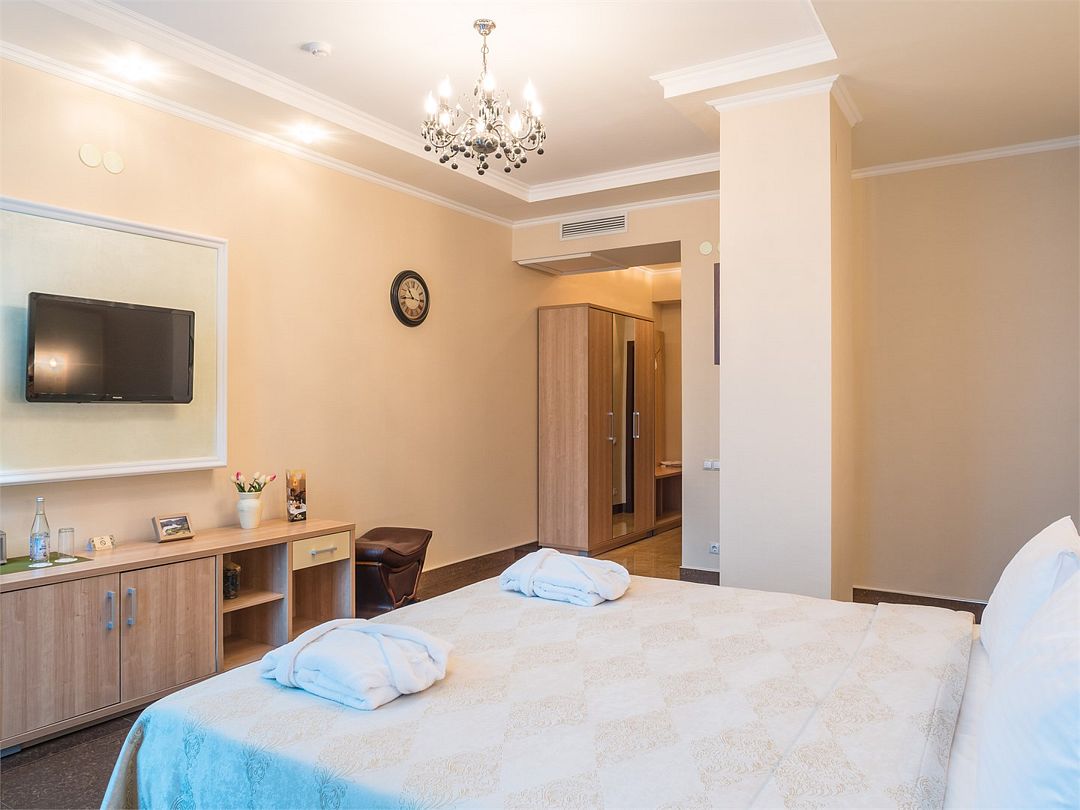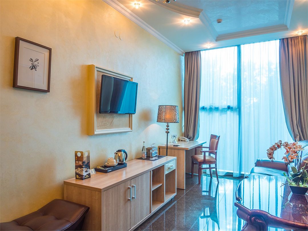 Элегантный двухкомнатный номер с панорамным видом, состоящий из гостиной и спальни, оборудованный просторной ванной комнатой с угловой джакузи или гидромассажной ванной. В спальной комнате: большая двуспальная кровать с прикроватными тумбочками, телевизор 3D, письменный стол и изысканное кресло из натурального дерева с оригинальной обивкой. Гостиная оборудована комфортабельной мебелью из натуральной кожи, телевизором, телефоном, шкафом для одежды. При необходимости кровать может быть трансформирована в две односпальные кровати. Номер рассчитан на одно- и двухместное размещение. Возможно бесплатное размещение ребенка до трех лет на одной кровати с родителями или с предоставлением детской кроватки. Диван в гостиной может использоваться в качестве дополнительного местаУслуги и удобства