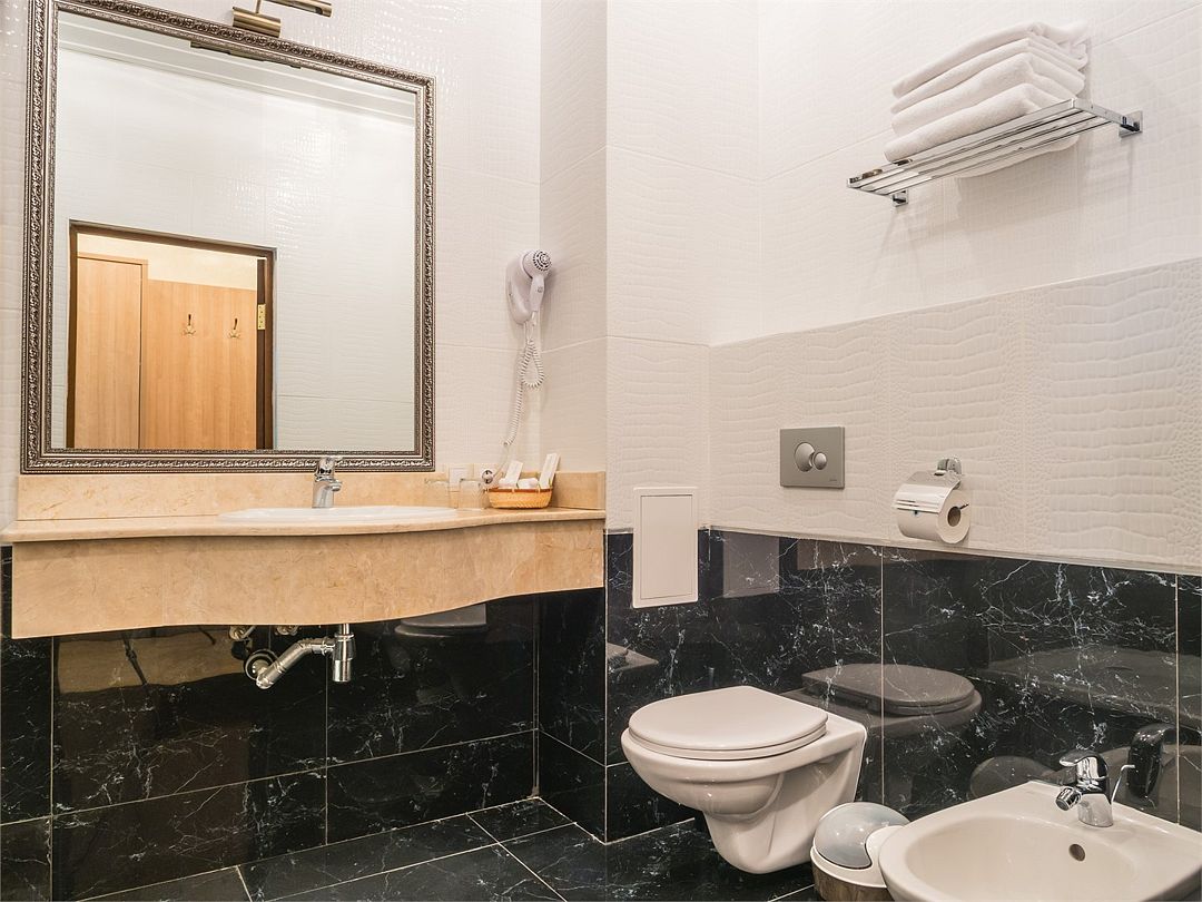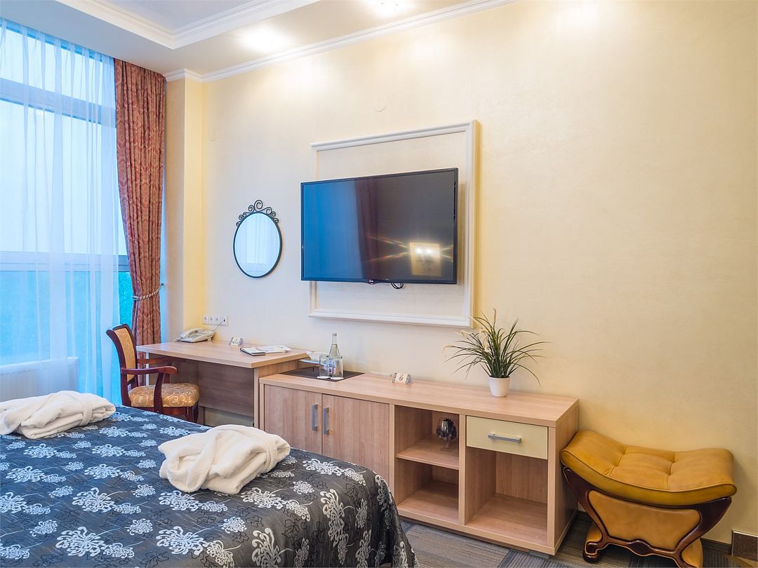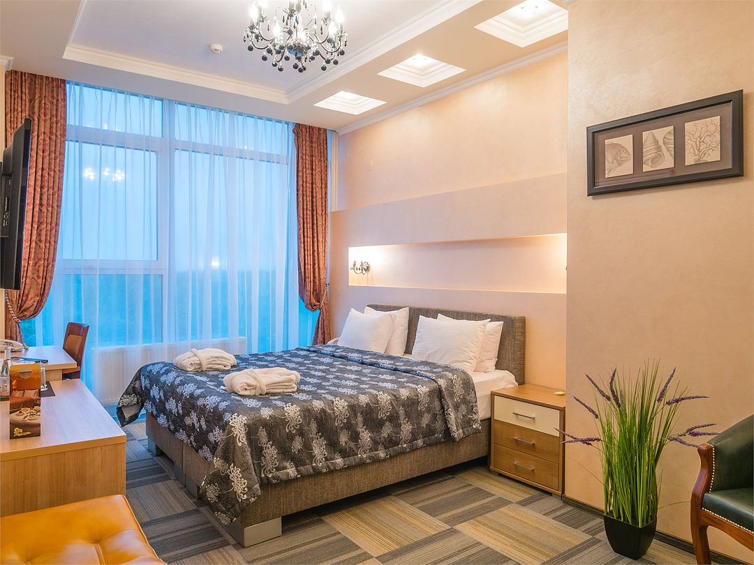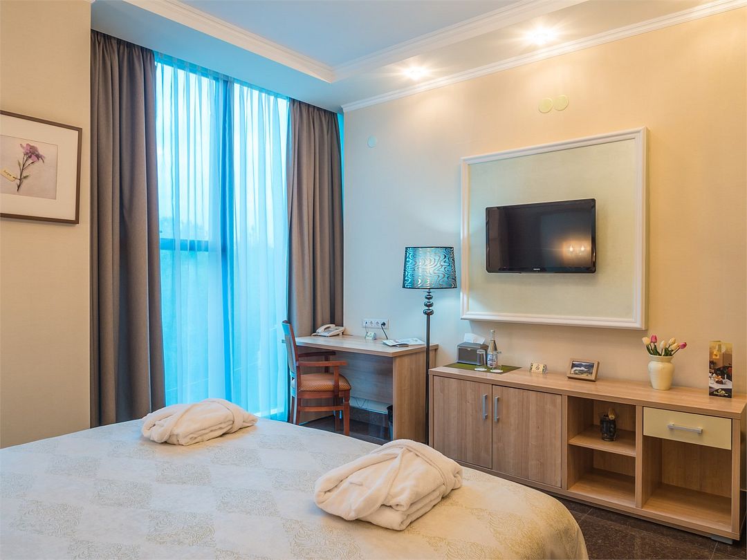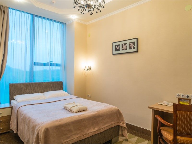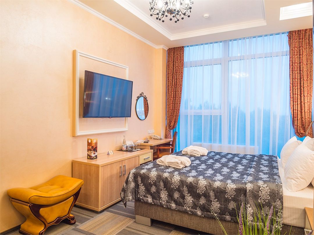 Комфортный однокомнатный номер с зоной коридора и просторной ванной комнатой. Номер оснащен двуспальной кроватью с прикроватными тумбочками и бра. При необходимости кровать может быть трансформирована в две односпальные кровати. Номер рассчитан на одно- и двухместное размещение. Возможно бесплатное размещение ребенка до трех лет на одной кровати с родителями или с предоставлением детской кроватки.Услуги и удобства