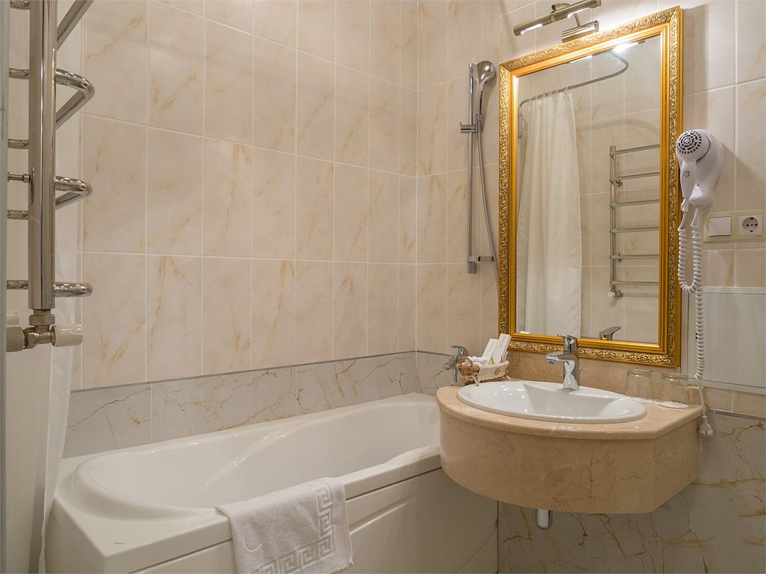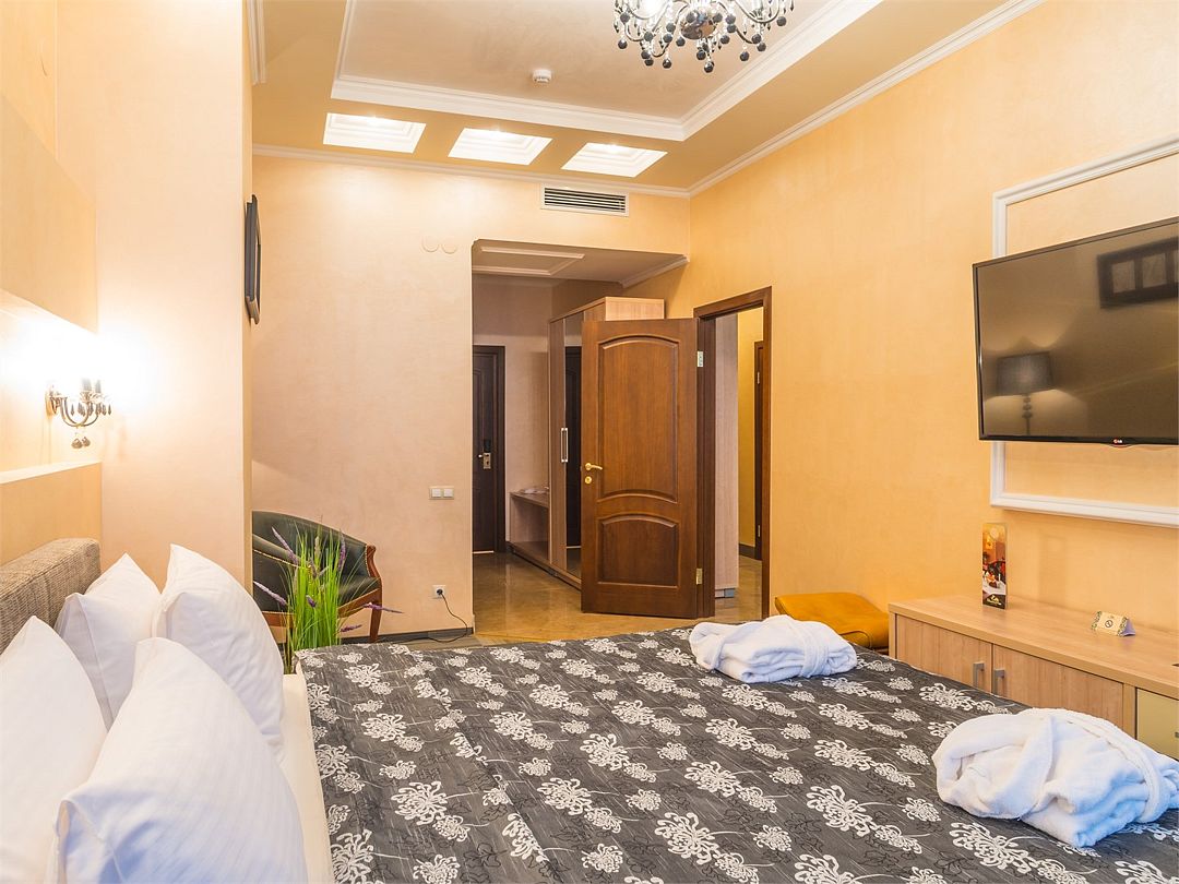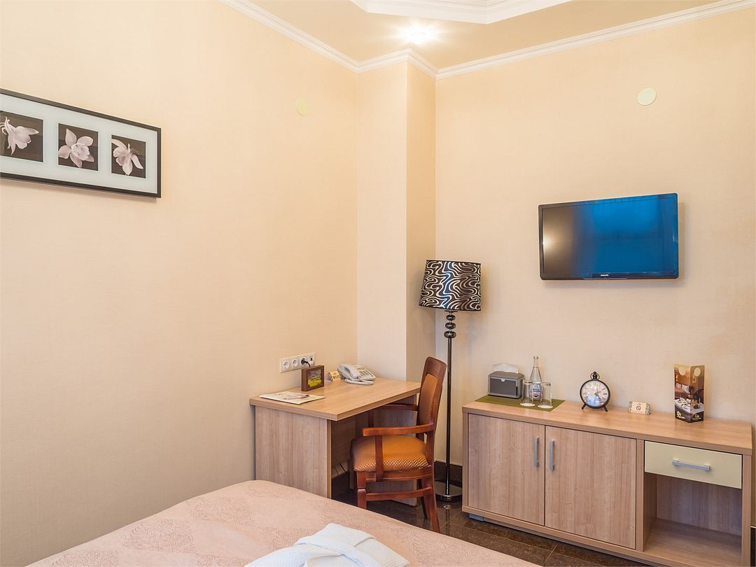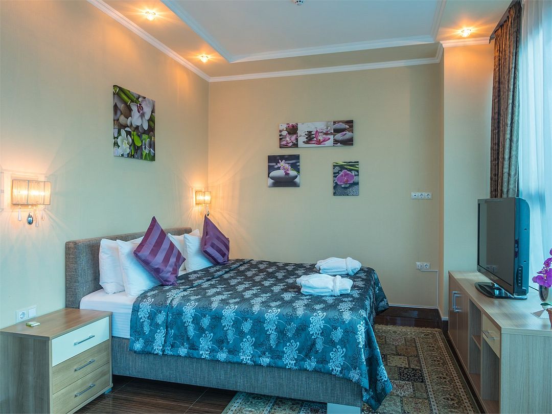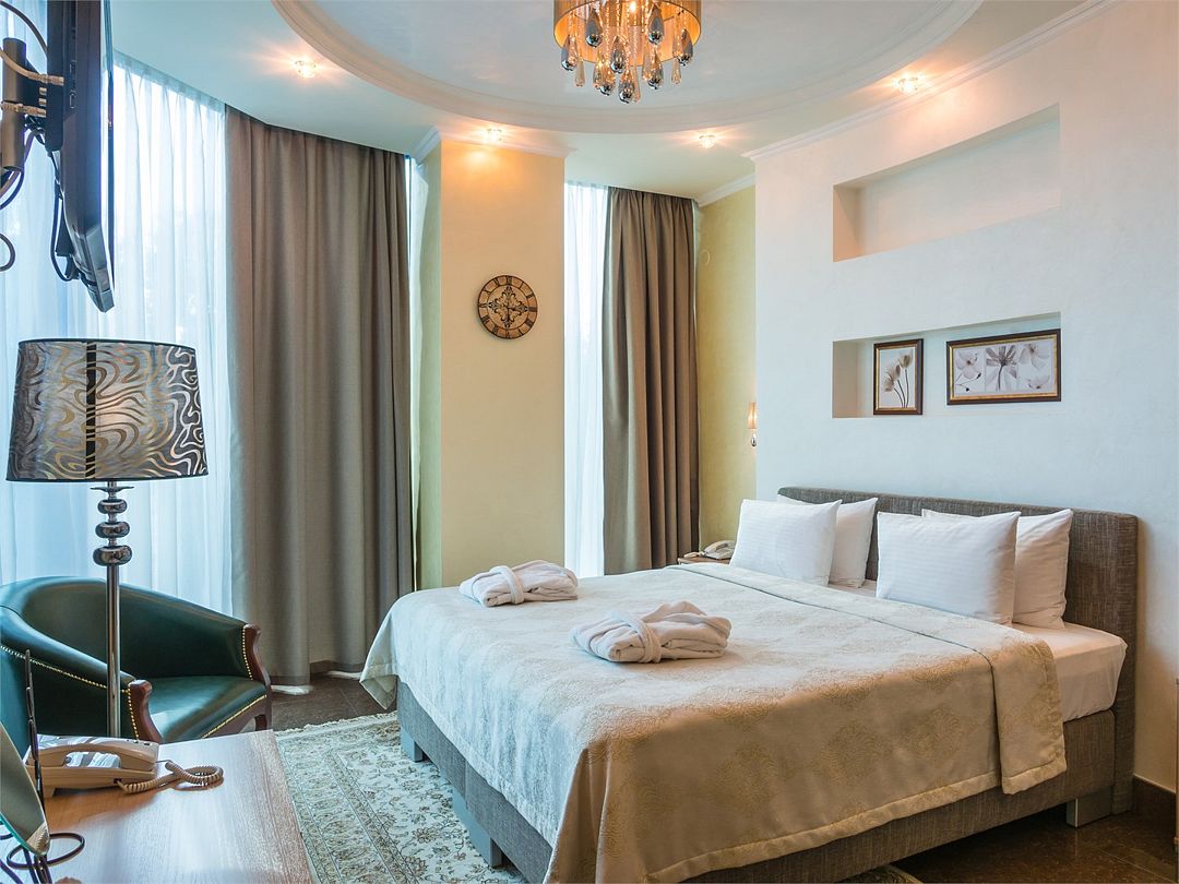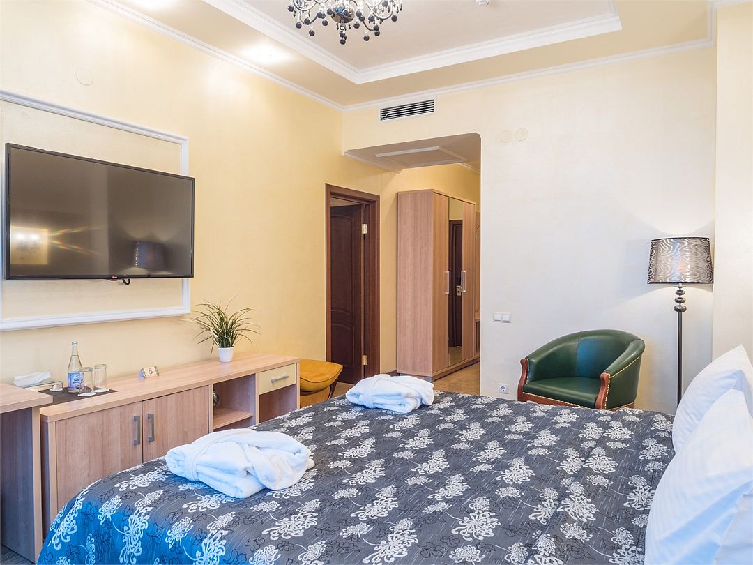 Комфортный однокомнатный номер с зоной коридора и просторной ванной комнатой. Особенностью номера является просторная спальная зона, оборудованная большой кроватью с прикроватными тумбочками и бра, наличием мягкой кожаной мебели и кресла из натурального дерева с оригинальной обивкой. При необходимости кровать может быть трансформирована в две односпальные кровати. Номер рассчитан на одно- и двухместное размещение. Возможно бесплатное размещение ребенка до трех лет на одной кровати с родителями или с предоставлением детской кроватки.Услуги и удобства