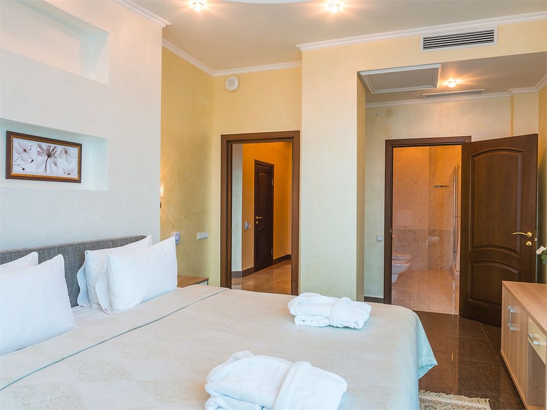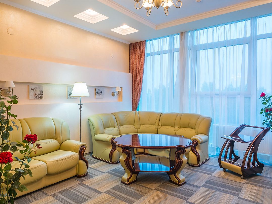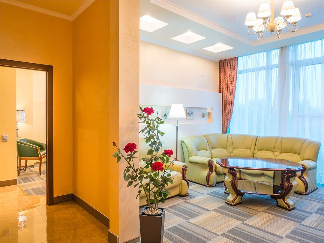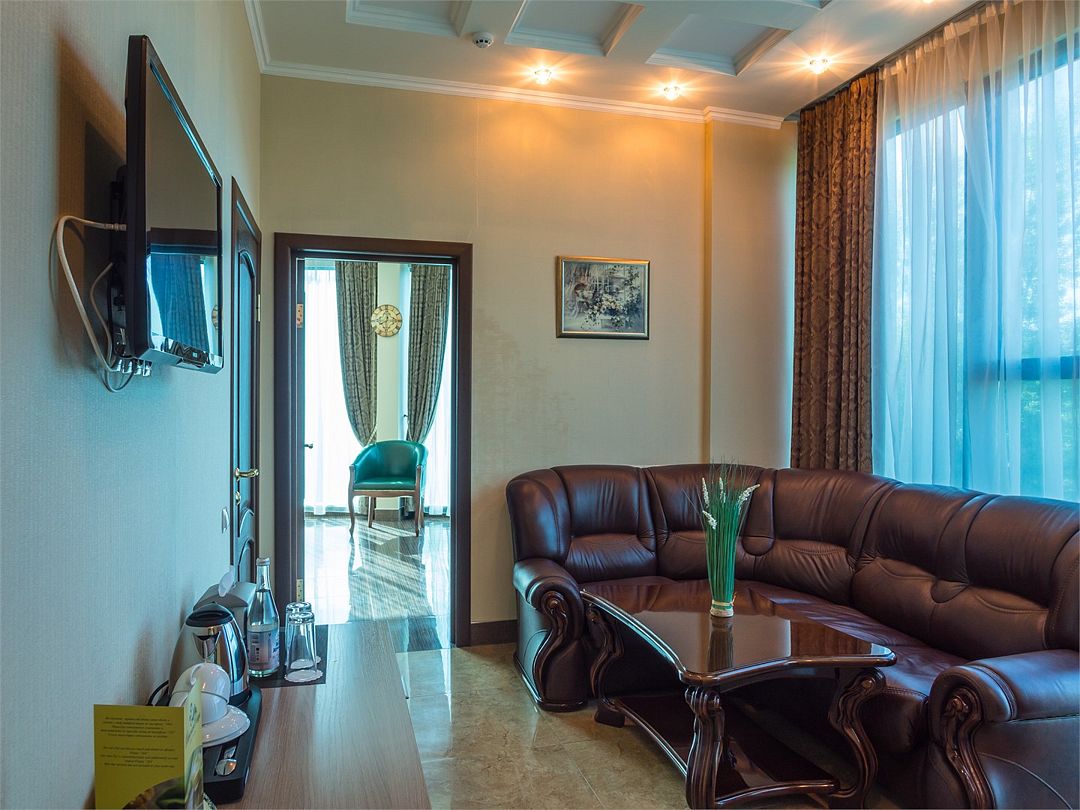 Просторный двухкомнатный номер с видом на рощу. Имеются изолированные гостиная и спальная комнаты, отдельная просторная ванная и гостевой туалет. В комнате отдыха спальный гарнитур идеально сочетается с люстрой и бра. Мебель гостиной - это изысканные кресла и диван из натуральной кожи, оригинальный кофейный и письменный стол со стулом. При необходимости кровать может быть трансформирована в две односпальные кровати. Номер рассчитан на одно- и двухместное размещение. Возможно бесплатное размещение ребенка до трех лет на одной кровати с родителями или с предоставлением детской кроватки. Диван в гостиной может использоваться в качестве дополнительного места.Услуги и удобства