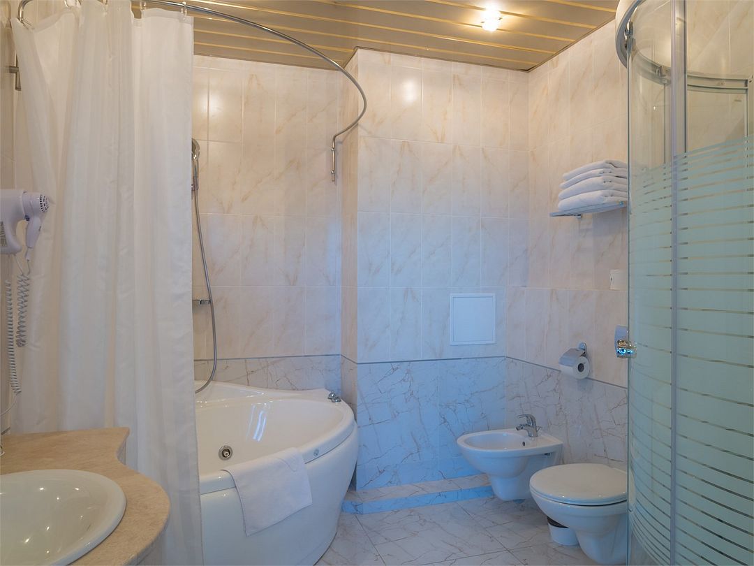Путешествие с семьейКурортный отельНомера просторные, потолки высокие. Матрас удобный. К тапочкам, кусковому мылу, шампуню, гелю для душа и халатам особых претензий нет, не считая дырки в рукаве халата. В ванной комнате и на чистых полотенцах встречаются чужие волосы. В душевой кабине нет полочек, поставить флакончик с гелем для душа некуда: либо держать в руках, либо перед входом намыливаться. Звуки из соседних номеров и из коридора проникают хорошо. Относительно свежий ремонт. Но, предположительно, из-за плохой гидроизоляции обои на стенах отклеиваются, вид ужасный. Также из-за усадки здания есть трещины на стенах и на керамической плитке. Жили в номере с видом на реку - при панорамных окнах красиво. Учитывая небольшую загрузку шведский стол на завтрак весьма разнообразен, но не пополняется, лучше приходить пораньше. Есть бесплатная парковка для авто.