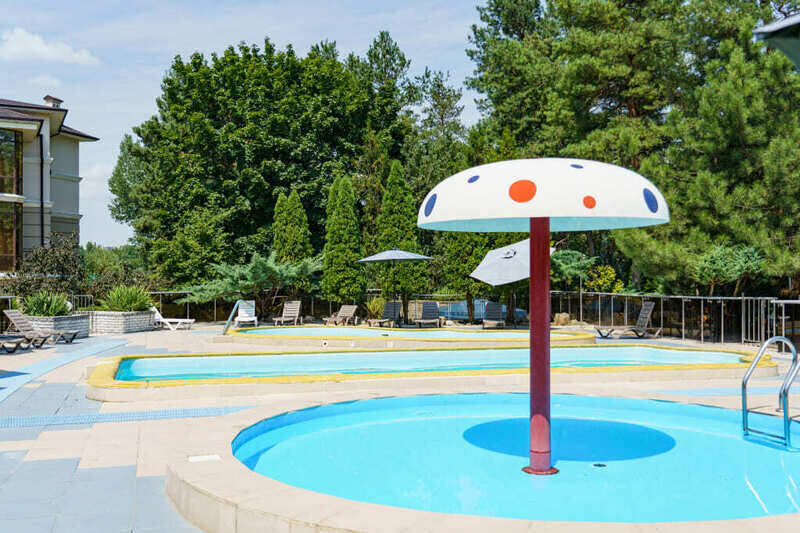 На огороженной охраняемой территории есть парковка, спортивные и игровые площадки, поляны для отдыха, 3 бассейна, беседки, места для мангалов, бар на свежем воздух.