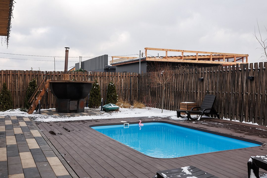 Загородный дом с подогреваемым водоемом и открытым кинотеатром. На территории могут разместиться до двадцати человек. Количество спальных мест — восемь.