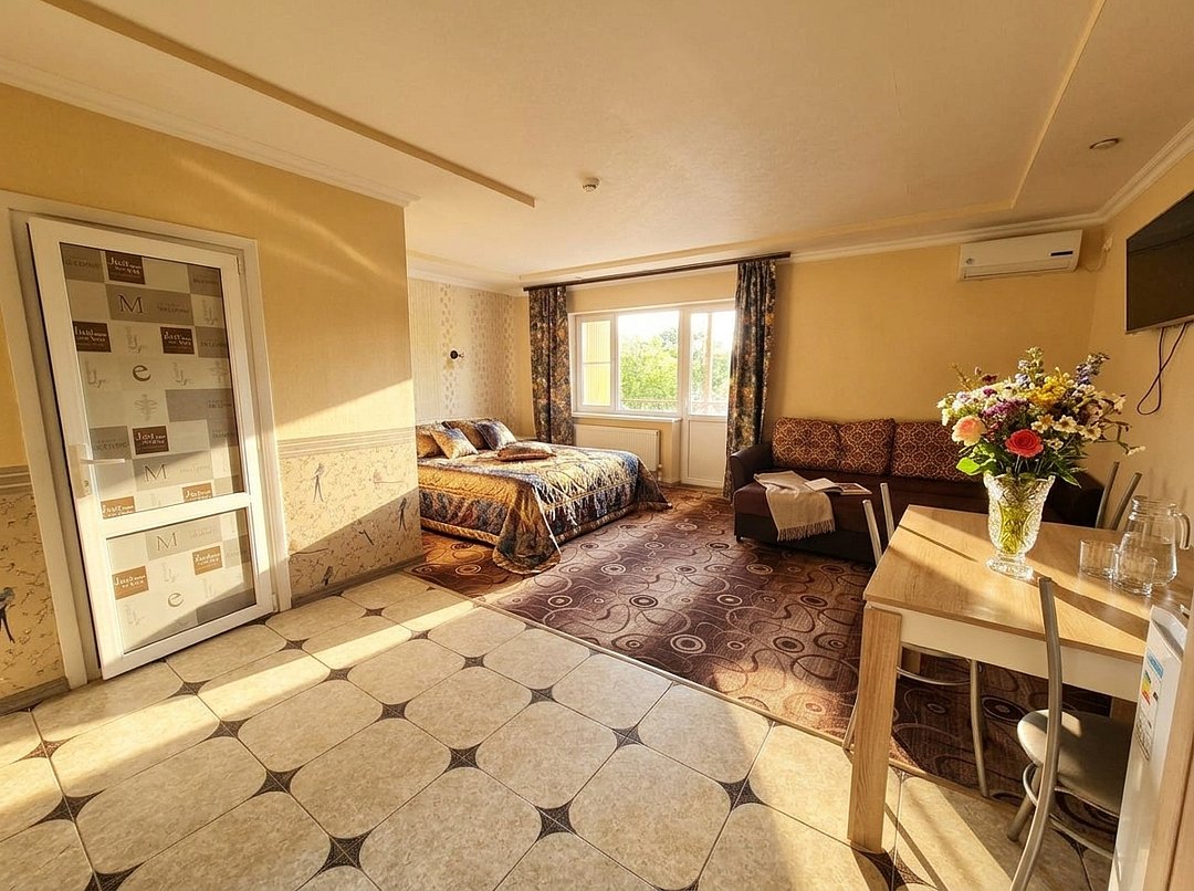 Номер полностью оборудован для комфортного проживания: к вашим услугам сплит система, телевизор, холодильник, посуда и обеденная зона со столиком и стульями. В санузле — новая качественная сантехника, фен и комплект полотенец. Горячая и холодная вода подаются без перебоев. По просьбе гостей горничная принесёт утюг и гладильную доску.