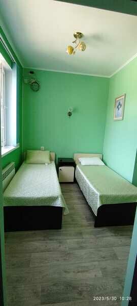 В номере имеются 2 односпальные кровати и окно и тумбочка.