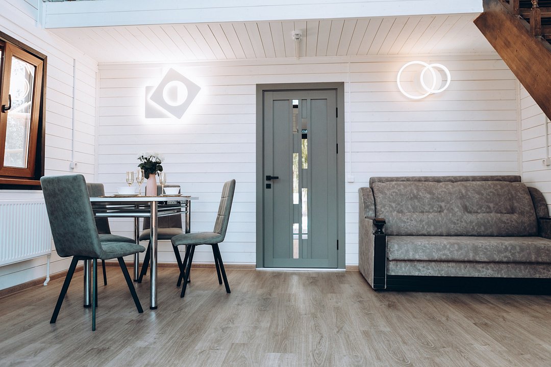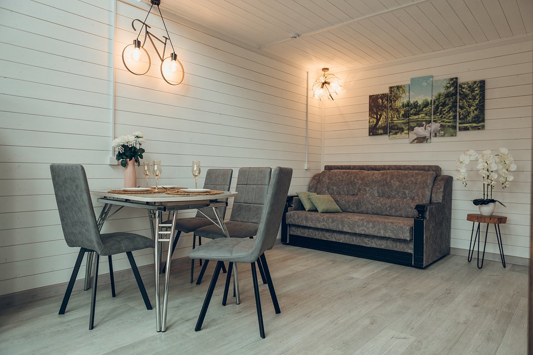 В интерьере этого дома царит атмосфера уюта и комфорта. Вас встретит двуспальная кровать, и удобный диван-кровать, мягкое постельное белье приглушенных тонов.