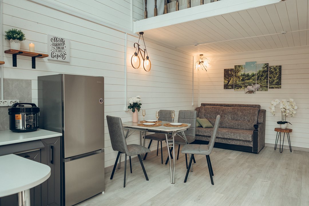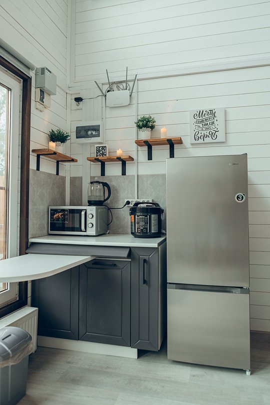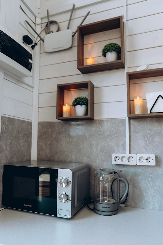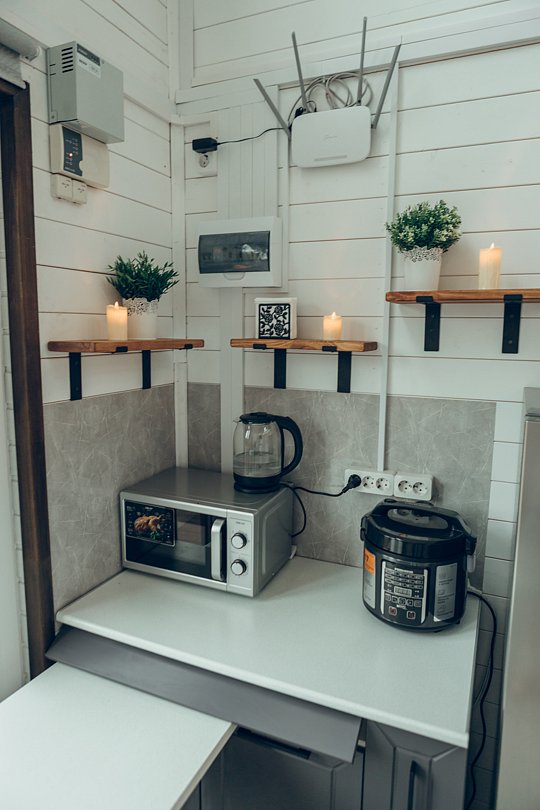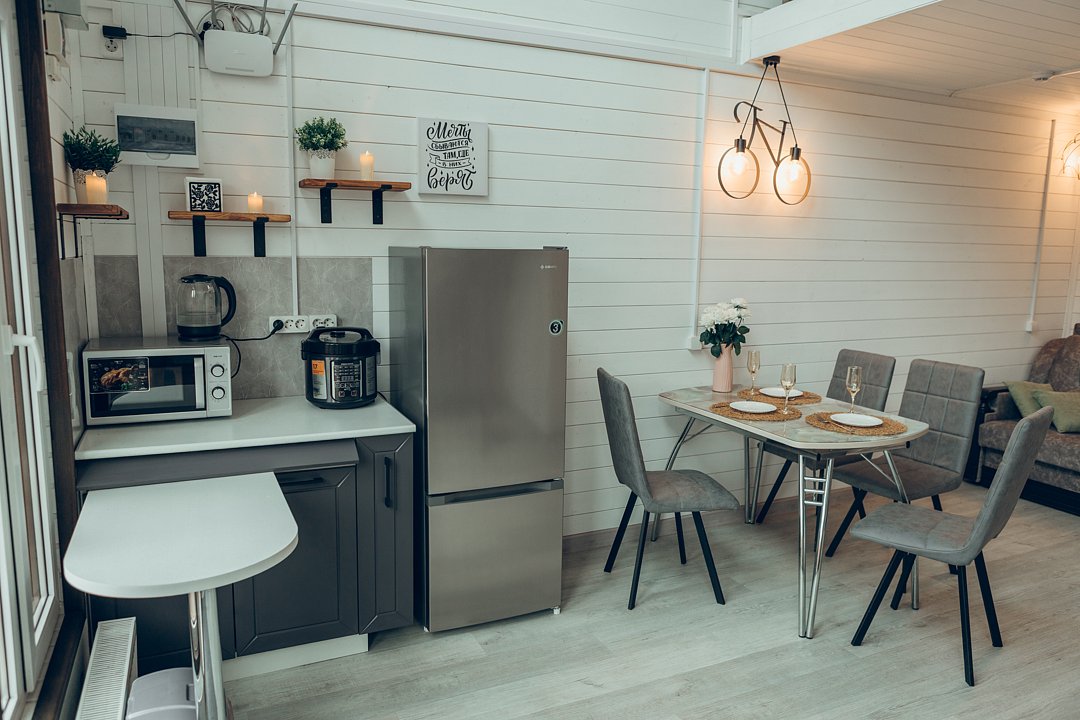 Не нужно беспокоиться о приготовлении еды, ведь здесь есть уютная кухонная зона со всем необходимым: мультиварка, посуда, холодильник, микроволнлвая печь - все для того, чтобы вы могли готовить свои любимые блюда.