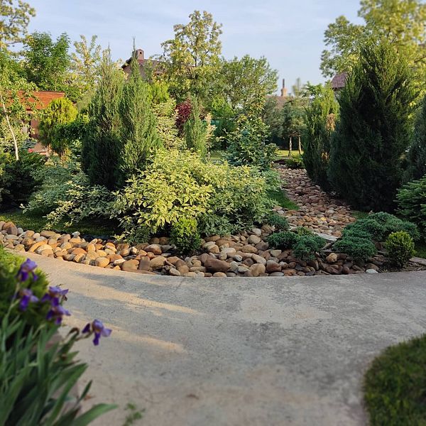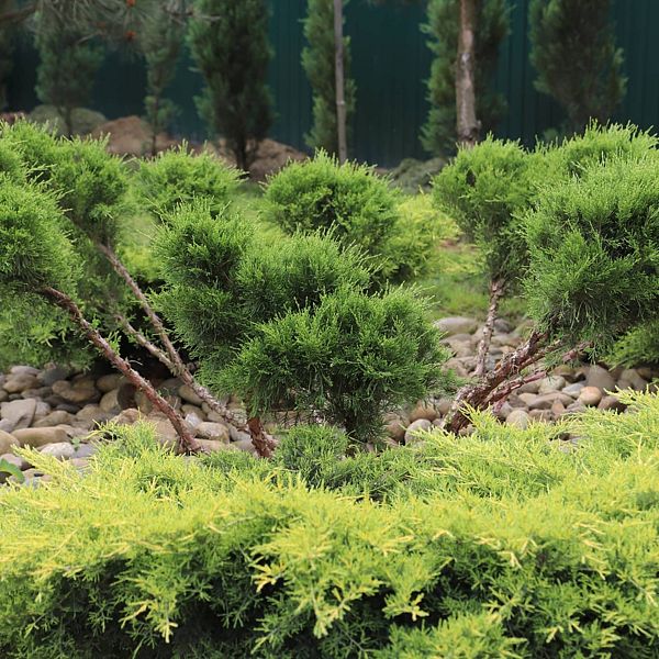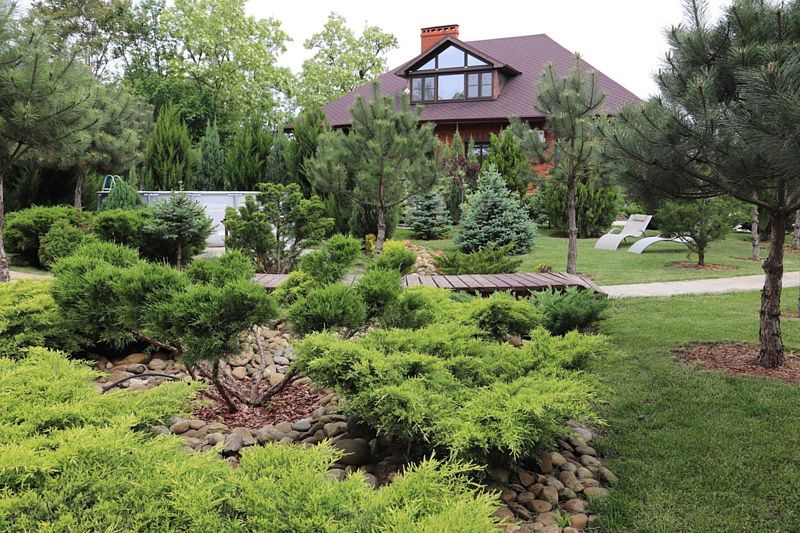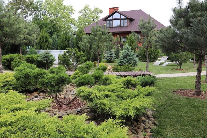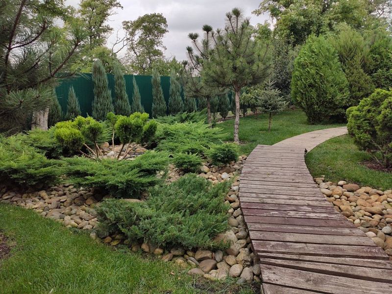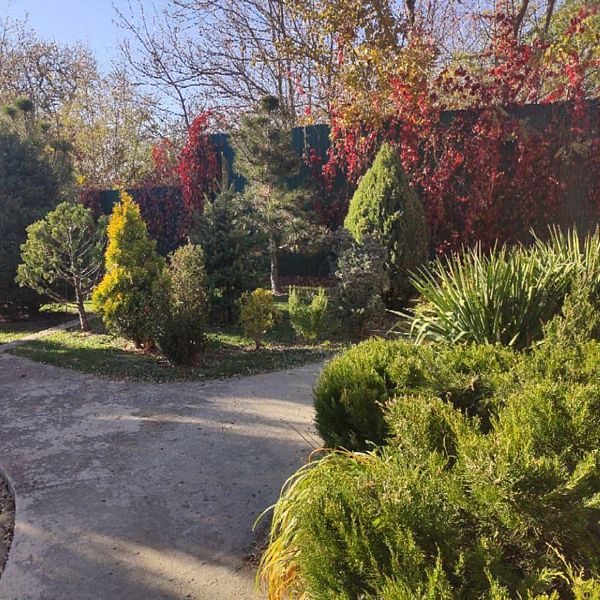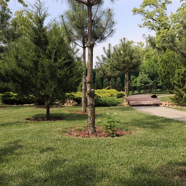 Высокие сосны, стройные ели и статные тисы создают мягкую тень, под которой распростерлись кустарники можжевельника, туи и самшиты. Кипарисы своими острыми верхушками устремляются к небу, придавая всему пространству торжественность и величие. Ухоженные газоны, покрытые мягким ковром, разбавлены яркими пятнами цветников, наполняющих воздух нежными ароматами.
