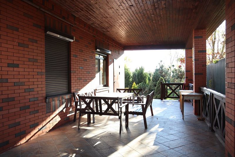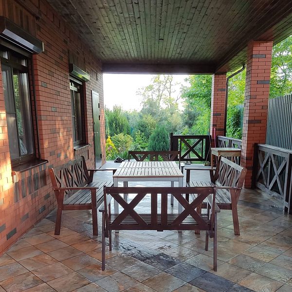 Органично дополняя архитектуру загородного дома, к нему примыкает просторная открытая терраса площадью в 58 квадратных метров. Этот уютный уголок идеально подходит для летних трапез на свежем воздухе. Здесь расставлены удобные столы, за которыми можно собраться всей семьей или дружной компанией и насладиться приготовленными на барбекю блюдами, любуясь окружающей природой.