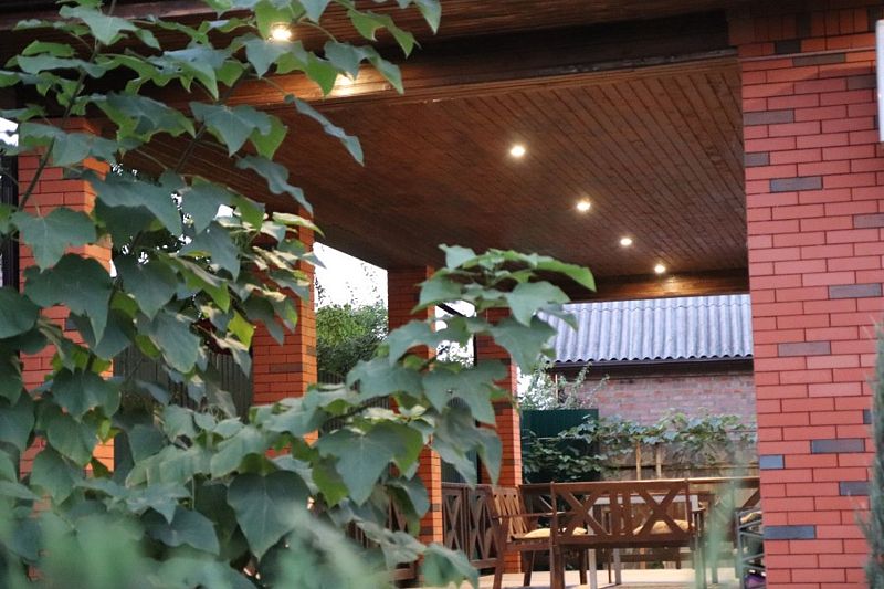 Окутанная ароматами дымка, территория загородного дома таит в себе уютный уголок для приготовления изысканных блюд на огне. Здесь расположилась настоящая зона барбекю, оснащенная современными мангалами, решетками, шампурами и даже вместительным казаном.