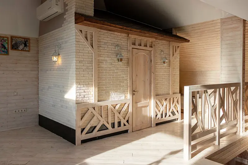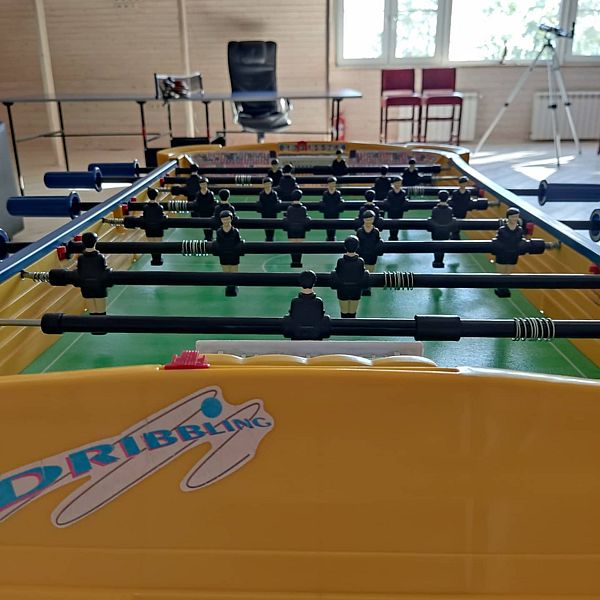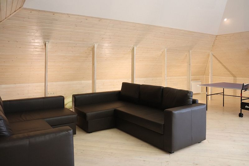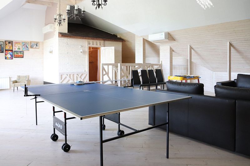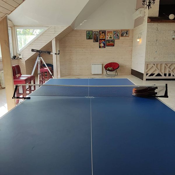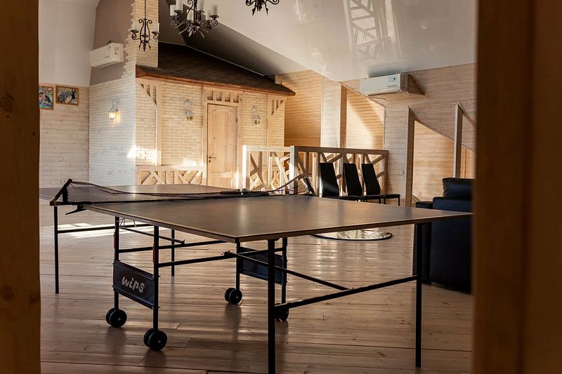Поднимаясь на второй этаж уютного домика в стиле шале, вы попадаете в настоящую зону активного отдыха. Здесь расположился теннисный стол, приглашающий гостей испытать свои силы в этой захватывающей игре.