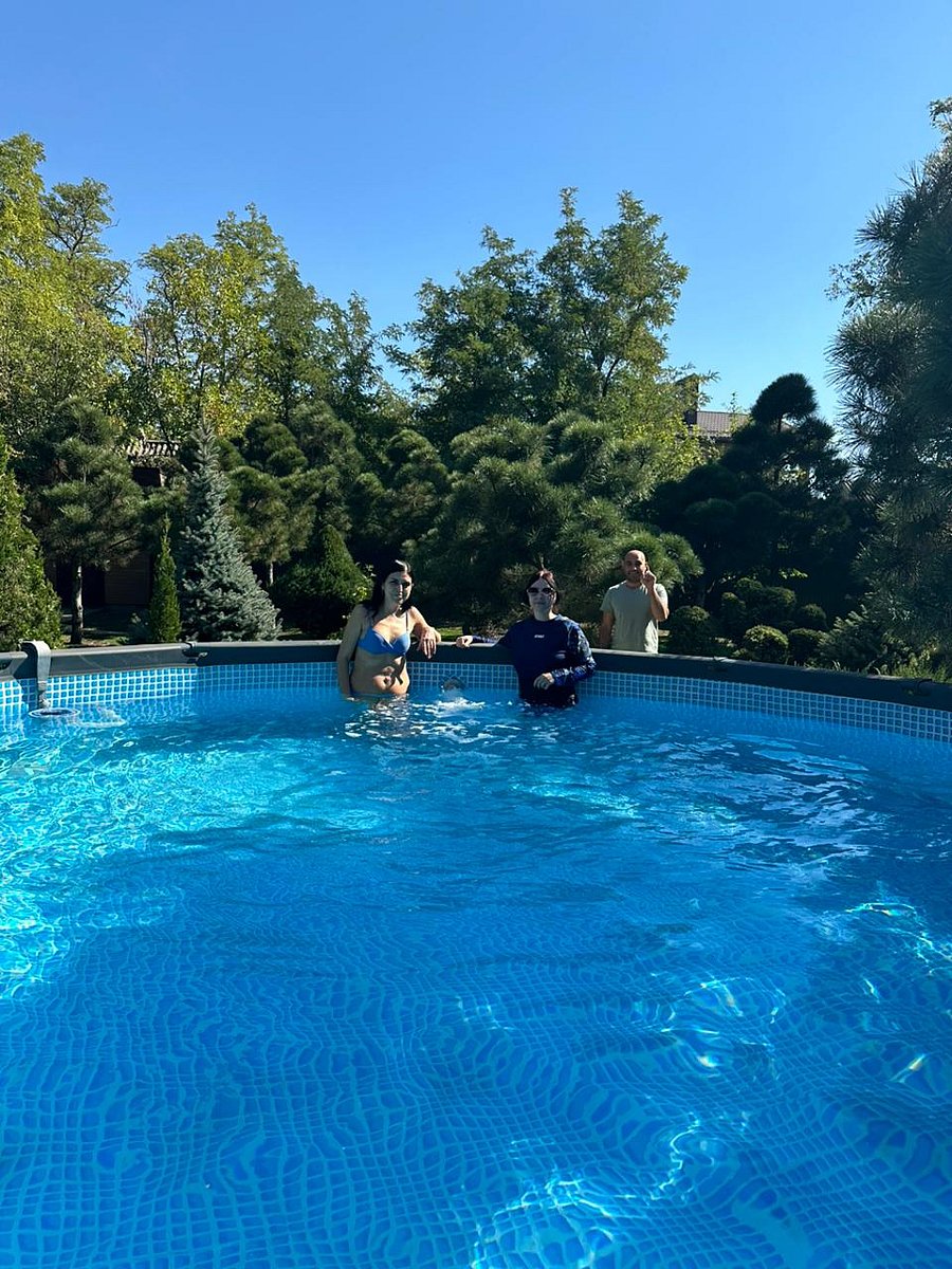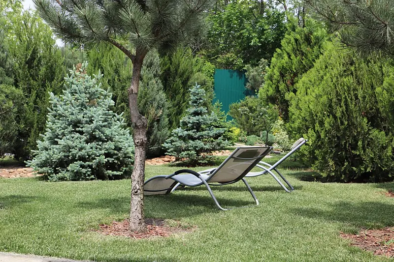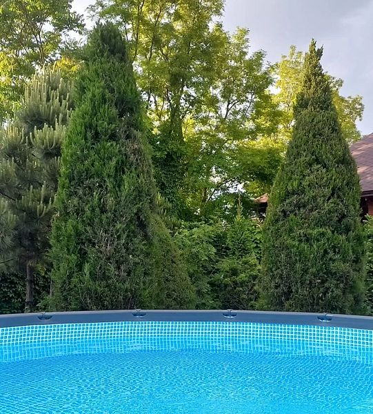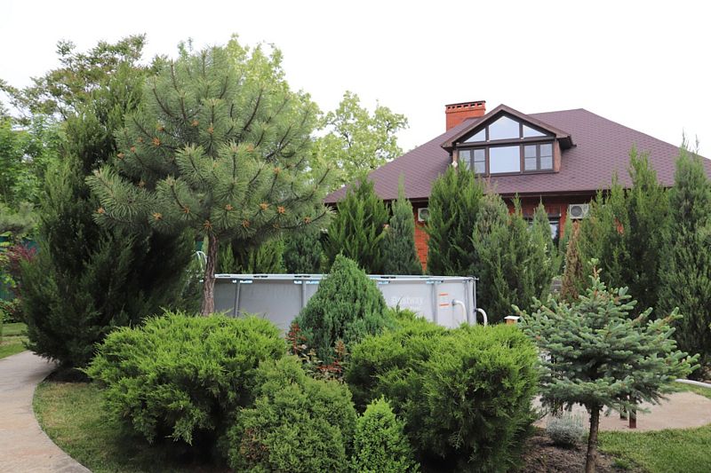 Прямо за пышными кронами сосен, елей и кипарисов укрылся уютный каркасный бассейн, приглашая гостей насладиться освежающей водой и солнечными ваннами на удобных шезлонгах. Это идеальное место для полного релакса вдали от городской суеты, где можно забыть обо всём, наслаждаясь гармонией природы и умиротворяющей атмосферой.