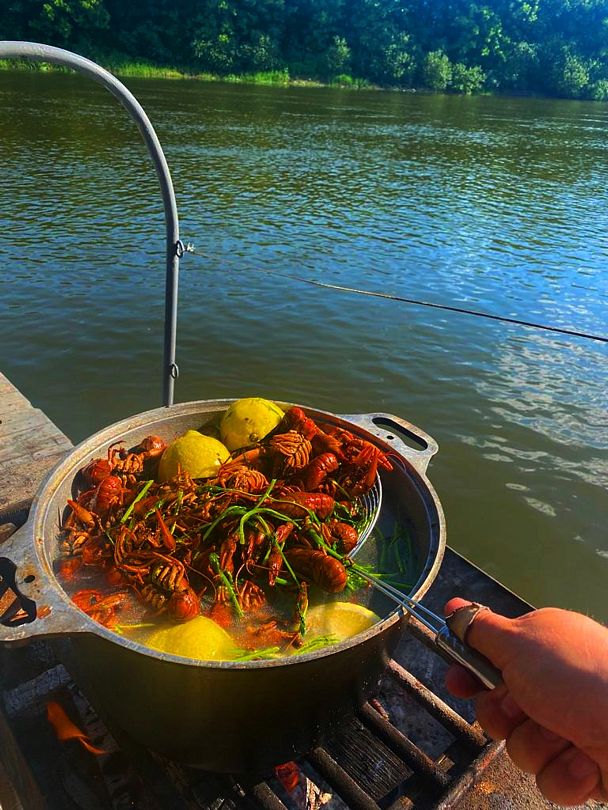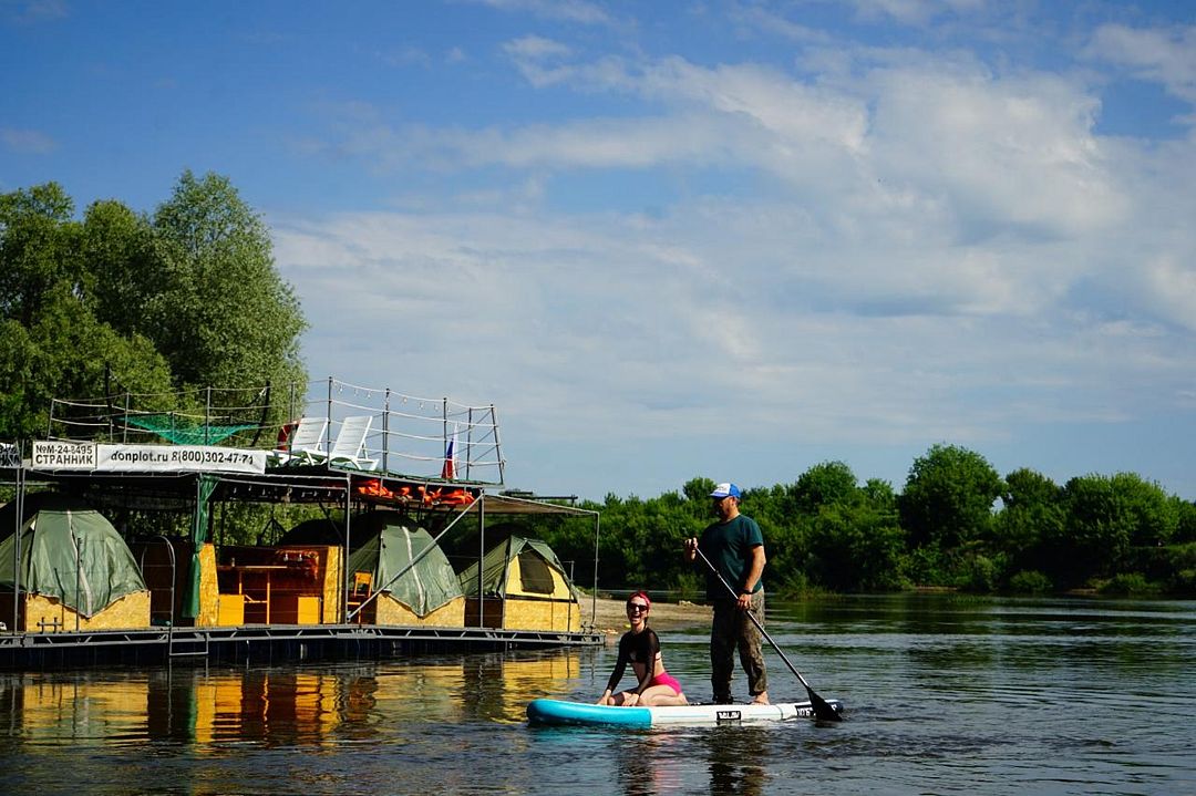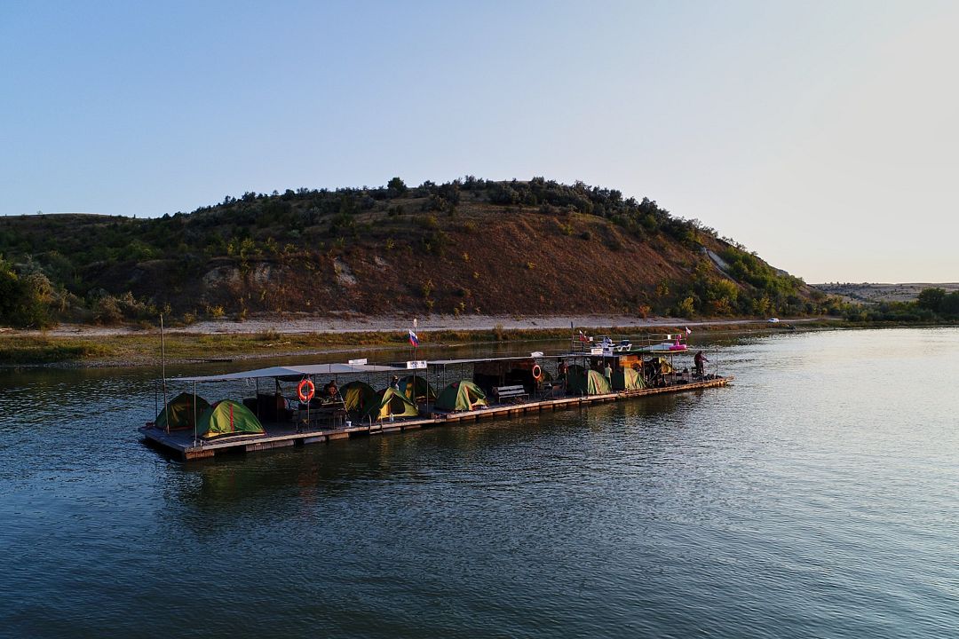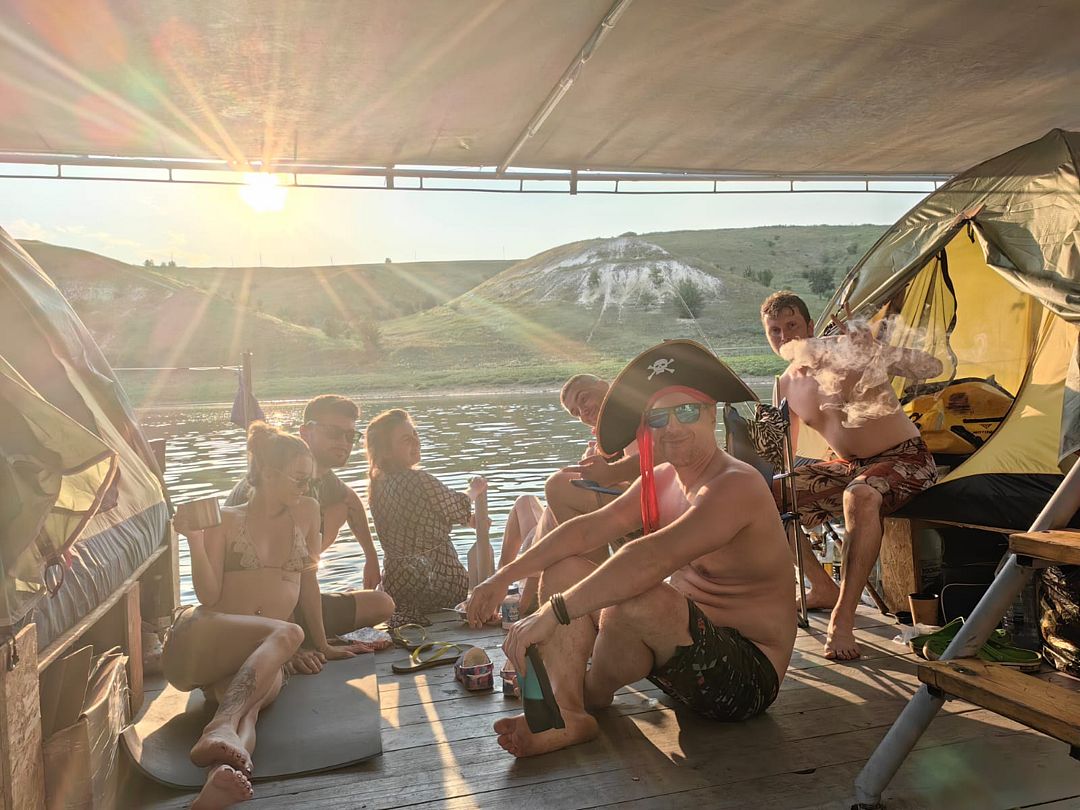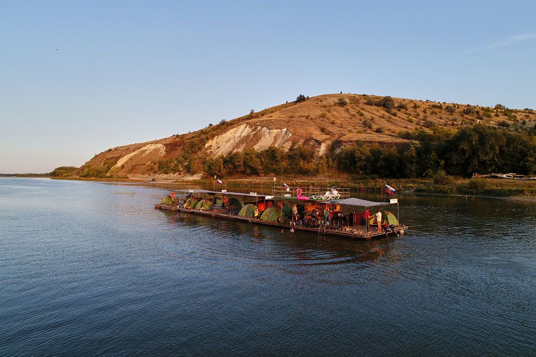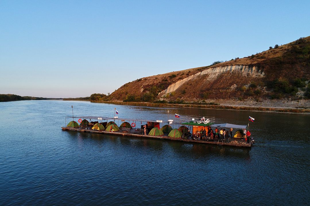 Каждый плот, как плавающий лагерь: палатки, тент, мангал, посуда... Идёшь себе по течению, пейзаж меняется: то леса, то меловые горы, где пещерные храмы, казачьи станицы и другие знаковые места. Тут, на Среднем Дону, всё настоящее, не причёсанное. Рыбалка хорошая: щука, сом, жерех, судак и другая белорыбица.