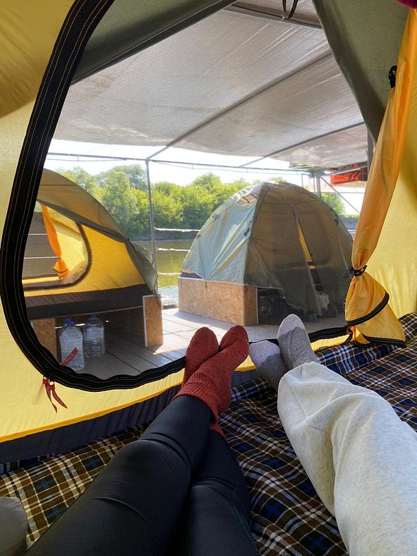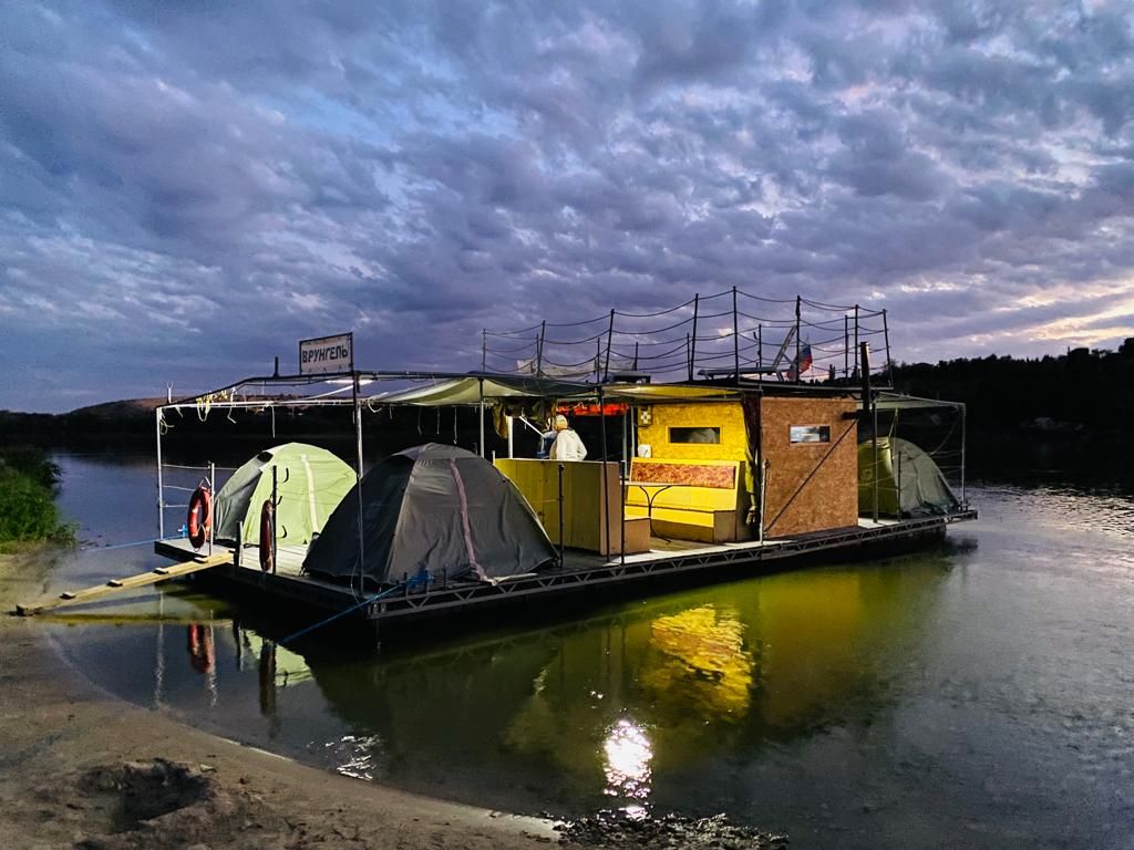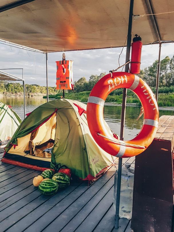Плот на 8 человека, 4 двухместные палатки с матрасами, зона мангала и зона кухни со всей необходимой посудой, плот накрыт тентом