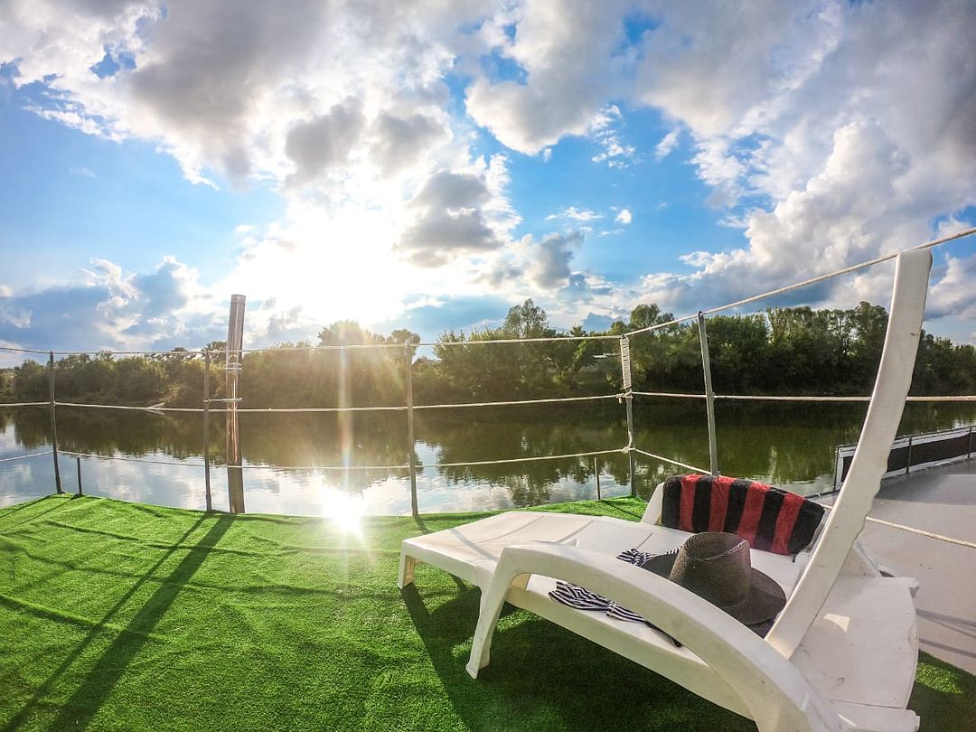 Баня, гамак и ротанговое кресло. Туристическая газовая плитка на 1 конфорку (газ. баллончик 1 в сутки). Подиумы под каждой палаткой, умывальник, душ, САП-борд, коптильня, музыкальная установка на весь плот, вода из расчёта 3л в сут. На человека, солнечные батареи, плот накрыт тентом