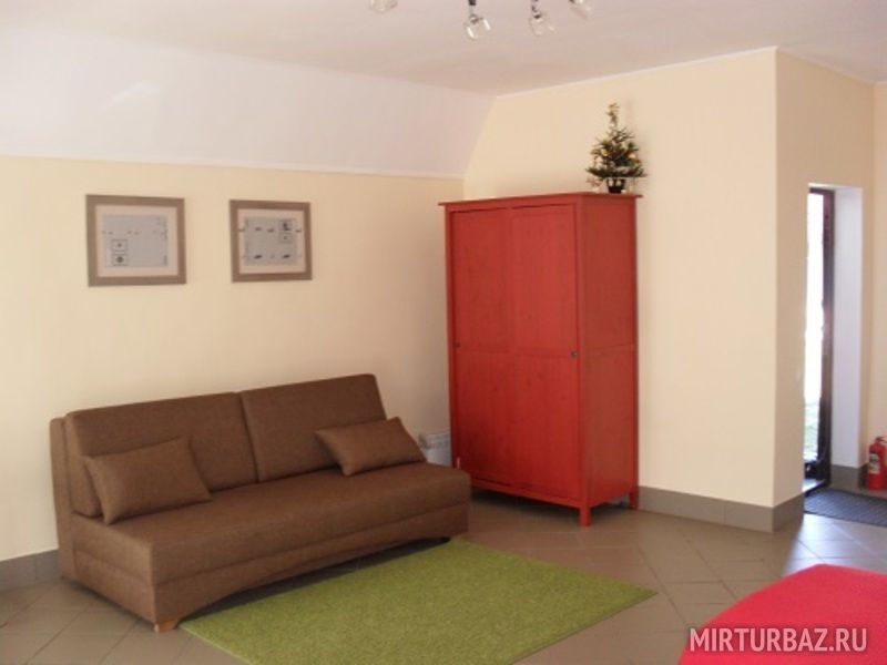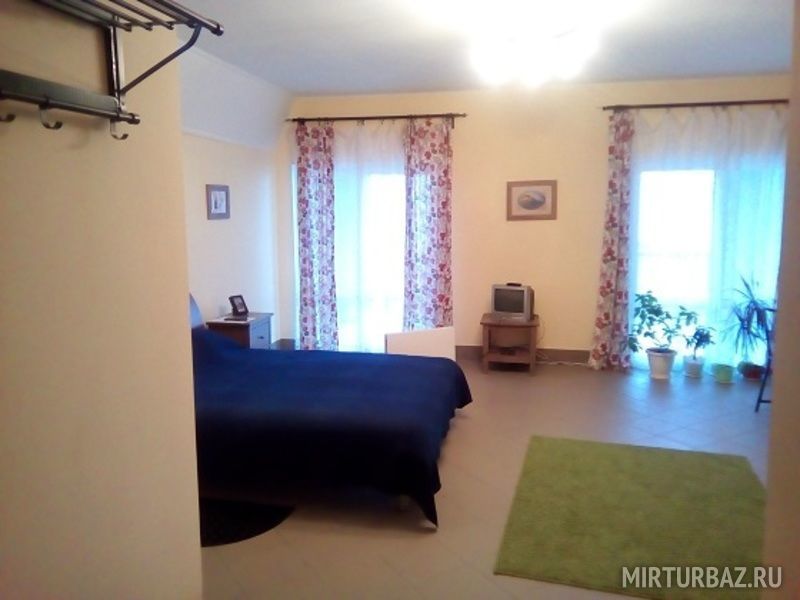Однокомнатный коттедж. В комнате располагается двуспальная кровать, прикроватные тумбы, раскладной диван, шкаф для одежды, мини столовая (стол, 2 стула, полка для посуды, чайник). Вентилятор. Санузел совмещенный с душем. Крытая терраса.