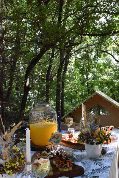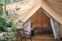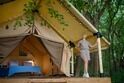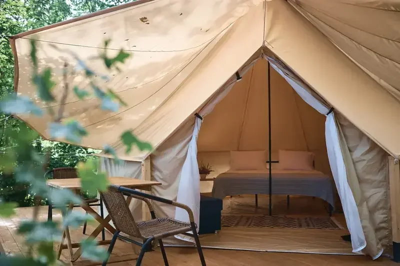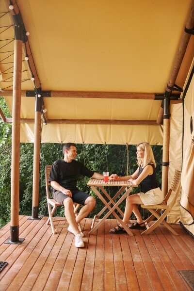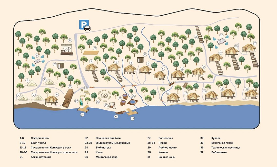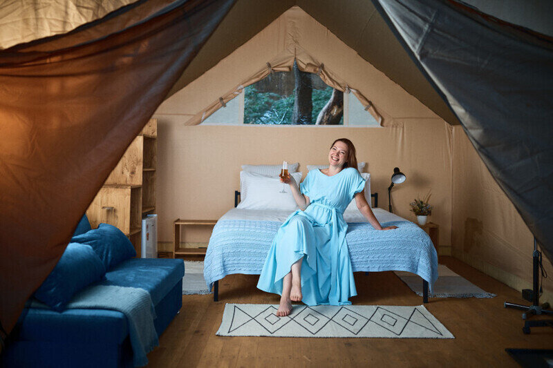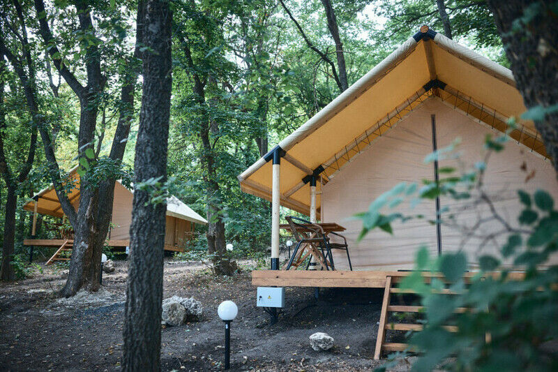 В глэмпинге предлагается 6 уютных сафари-тентов, расположенных среди лесной зелени, а также 4 белл-тента, расположенных вдоль реки. Внутри каждого тента имеется комфортабельная мягкая мебель для отдыха, а также удобные места для хранения вещей. Все тенты оборудованы индивидуальным санузлом с душем. Гостям предоставляются чистые полотенца, халаты, тапочки и гигиенические принадлежности.