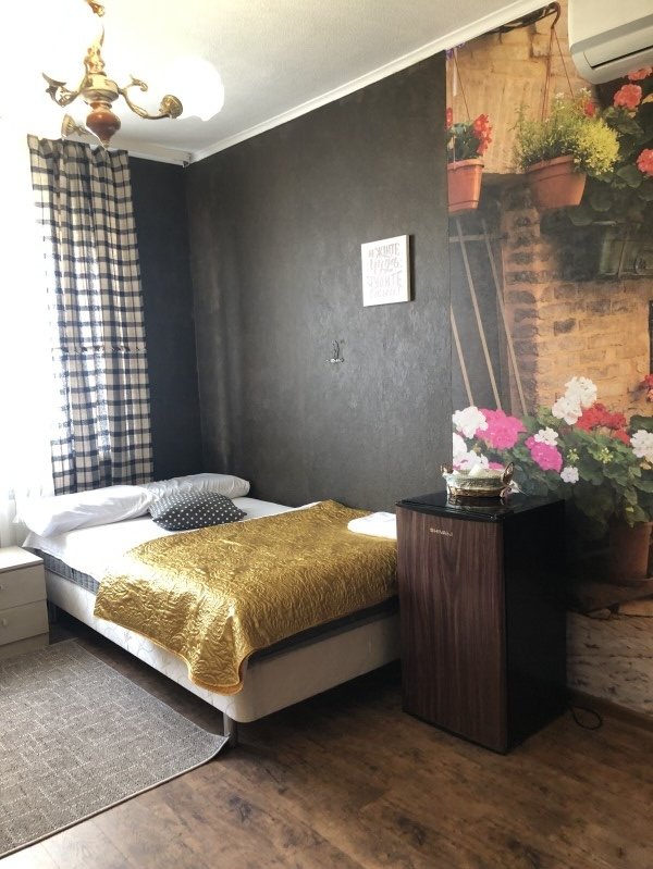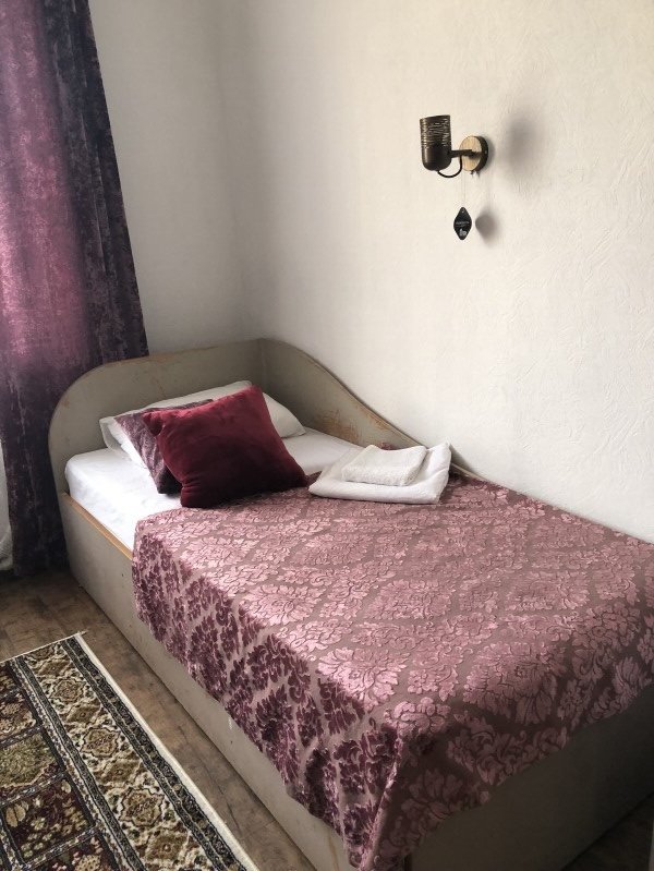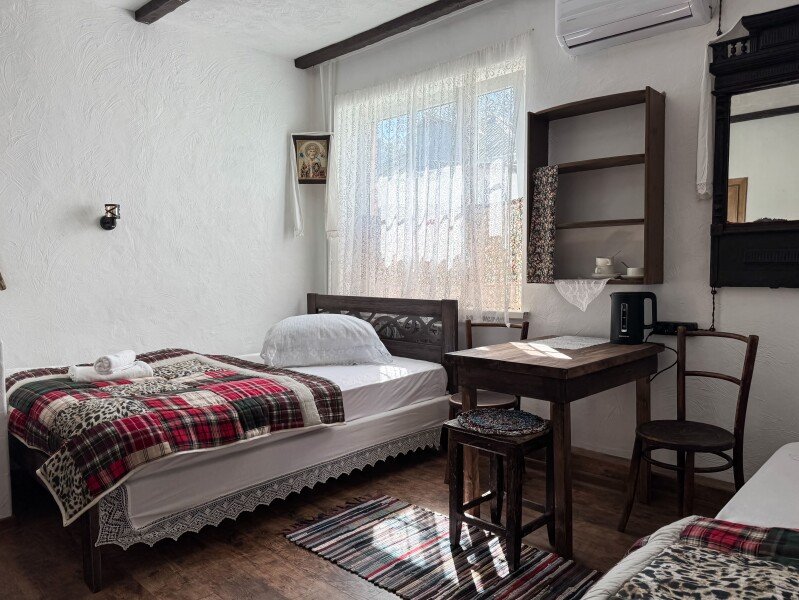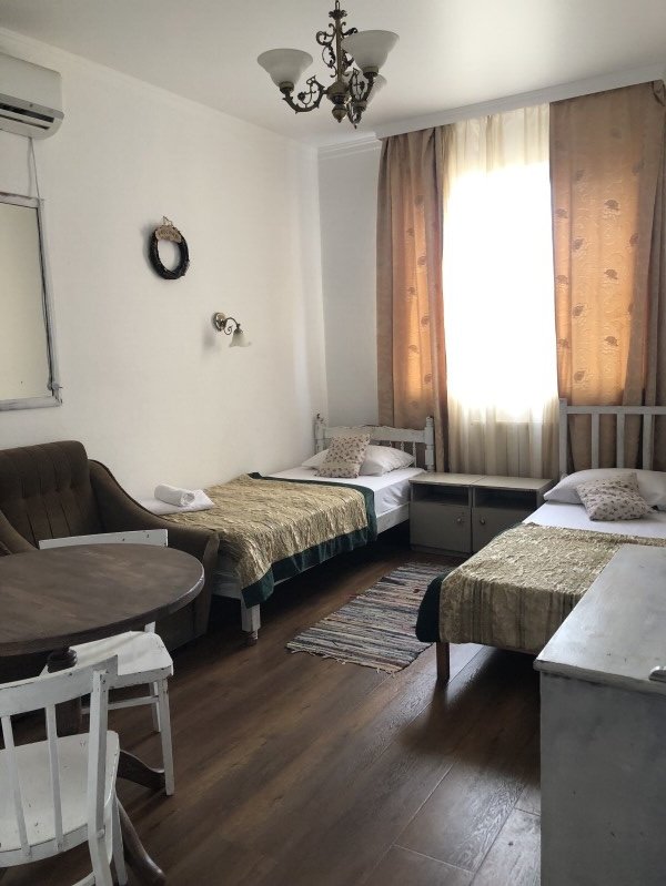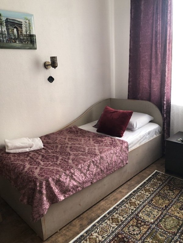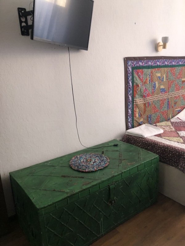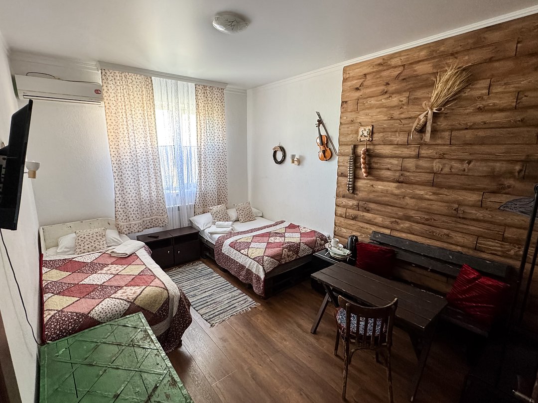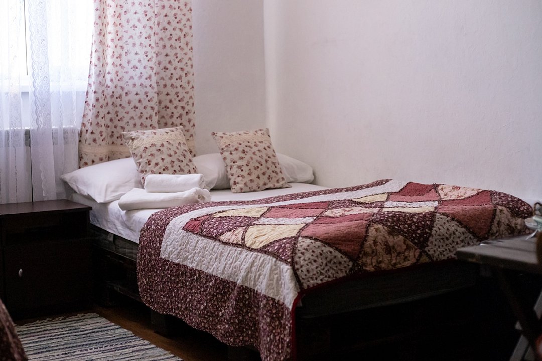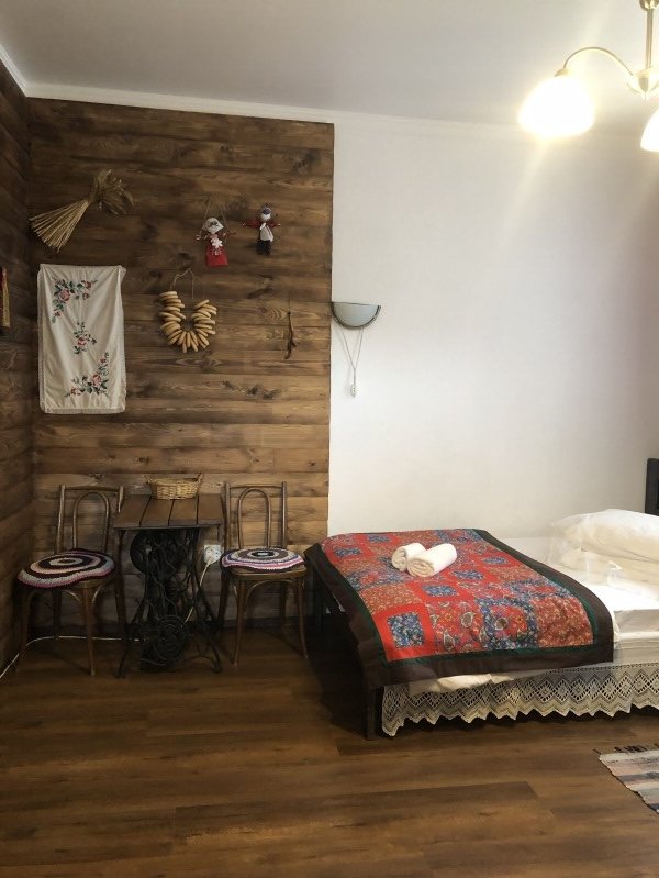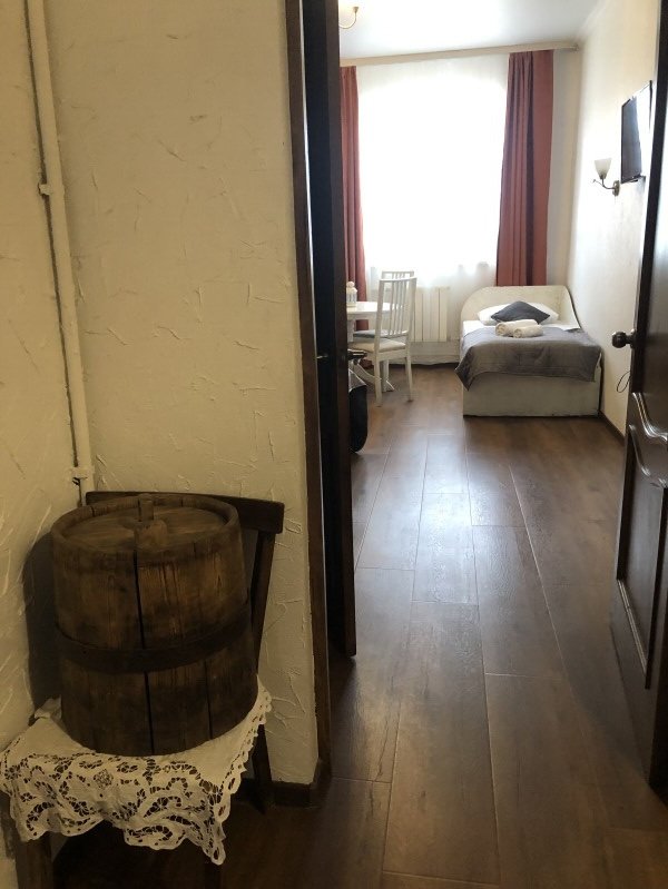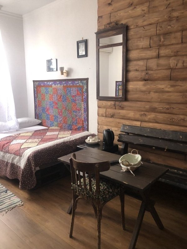 Уютный номер в деревенском стиле с сундуком и лавкой. Стена обшита натуральным деревом. С видом на старые домики Ростова. Тихо и уютно.