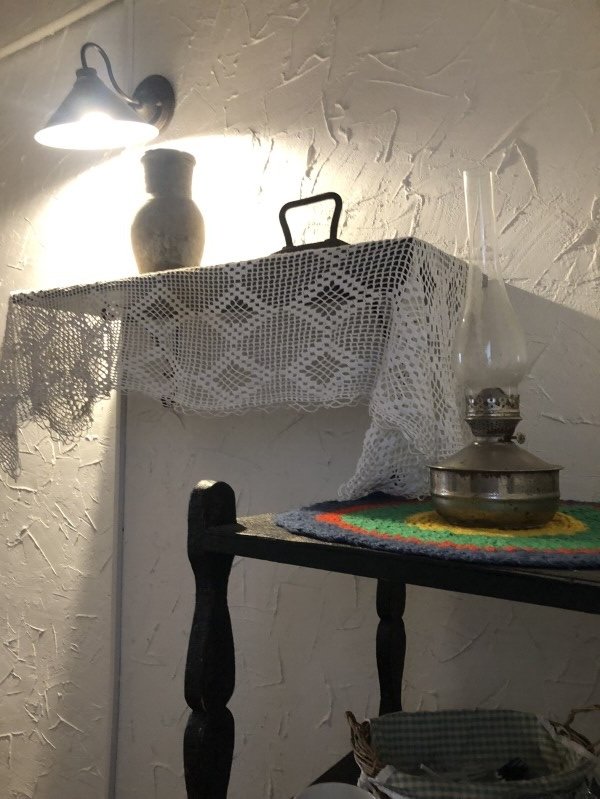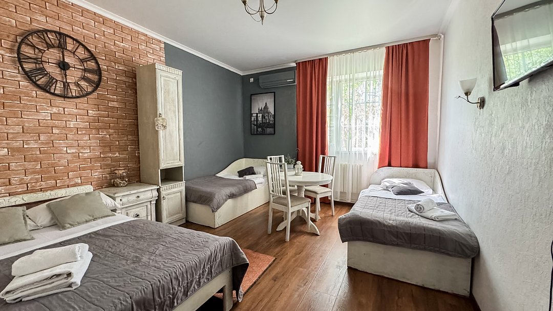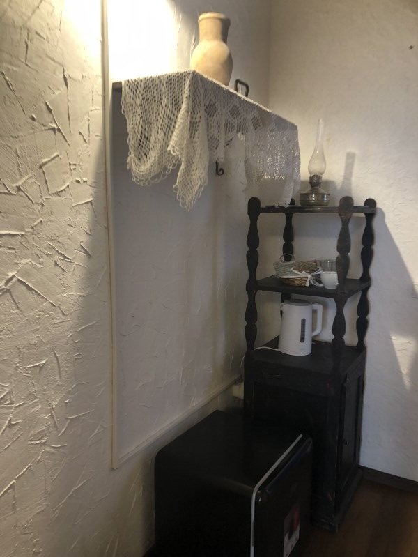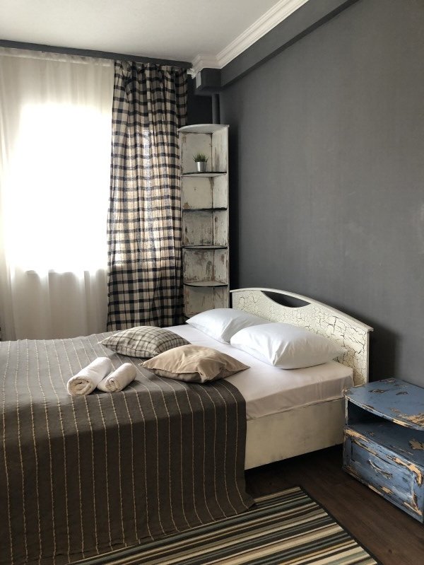 Номер выполнен в стиле эклектики: лофт и прованс. При входе вас встречает казачья икона с рушниками.