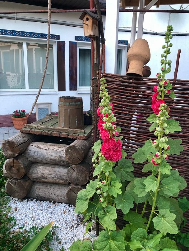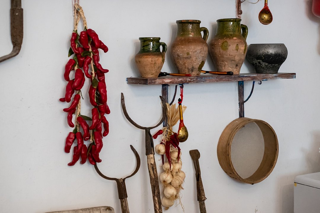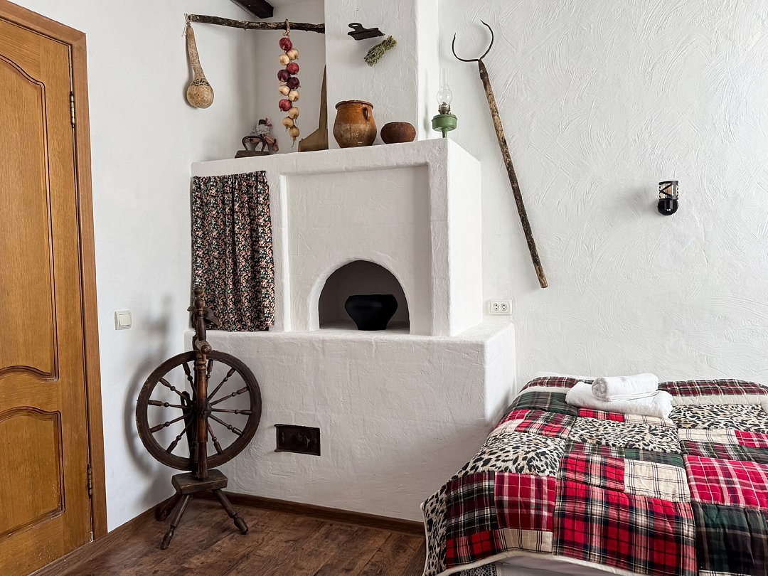 Номер выполнен в казачем стиле. Сундук, которому больше 100 лет, сохранил старые наклейки. Прялка. Швейная машина, стилизованная под стол. Казачье зеркало. На подушках накидки, как в настоящей казачьей избе. Половички и старинные вышивки.