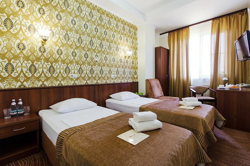 Номер имеет комплектацию с двумя односпальными кроватями. Это делает возможным отдых в номере как полной, так и не полной семьей. Кроме этого, в нем также находится журнальный столик, два стула, две тумбочки и шкаф. Этой мебели достаточно, чтобы можно было комфортно расположиться на некоторое время.