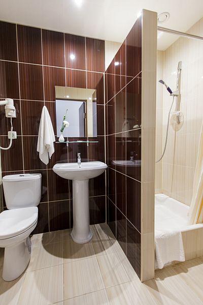 В номере двуспальная кровать, раскладной диван, телевизор, холодильник, чайник, 2 тумбочки, журнальный столик, 2 стула, шкаф, сейф, кондиционер. Санузел с душем или ванной, фен. В номере есть телефон, для связи с администратором и другими гостями отеля.