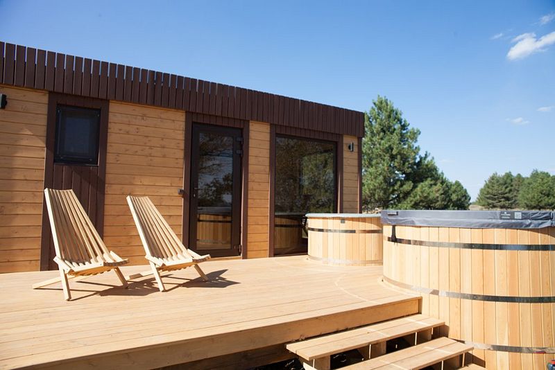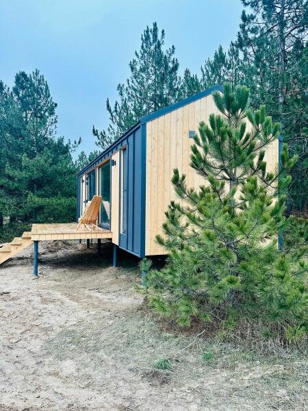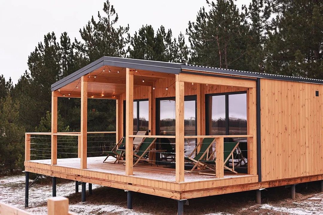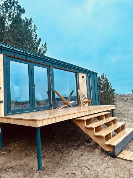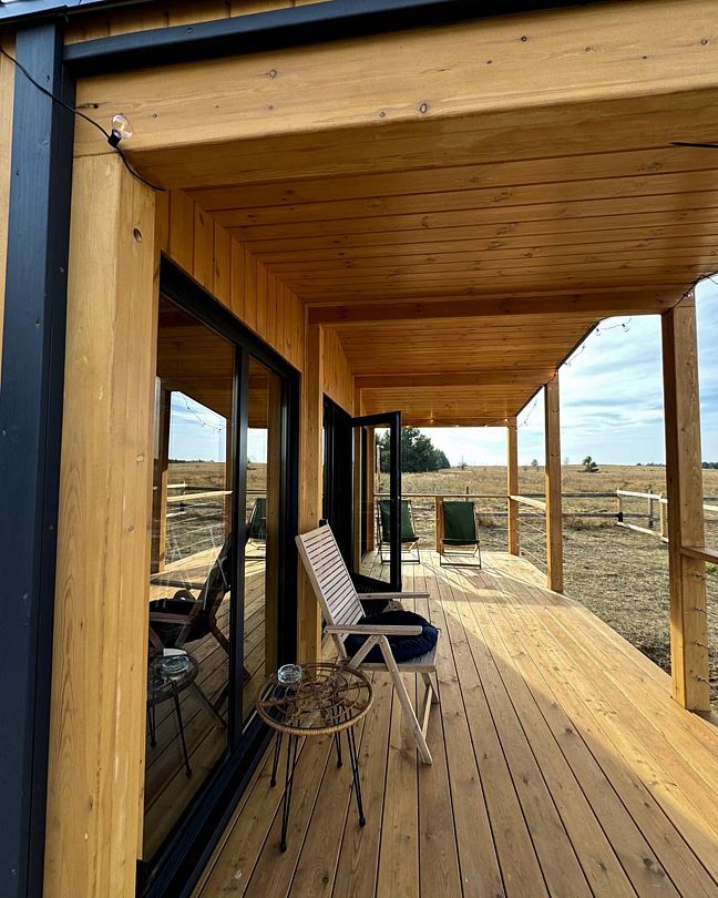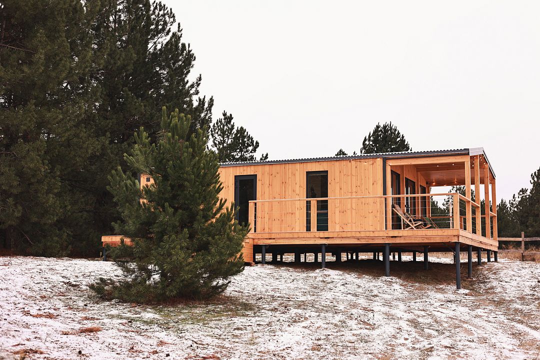 Деревянный дом с панорамными окнами стоит на опушке соснового леса. На террасе вы можете насладиться закатом и травяным чаем.