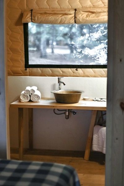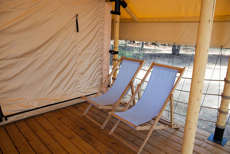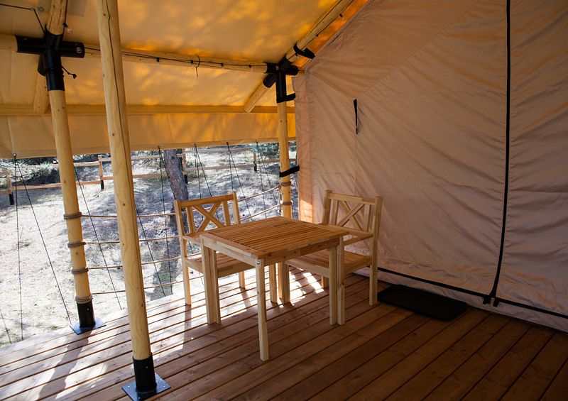 Аутентичная увеличенная сафари-палатка со всеми атрибутами первоклассного отеля внутри. Собственная терраса (закрывается прозрачным ПВХ в холодное время года — защита от ветра) с шезлонгами и столиком. На улице рядом с тентом расположен индивидуальный бассейн — подогреваемая купель.