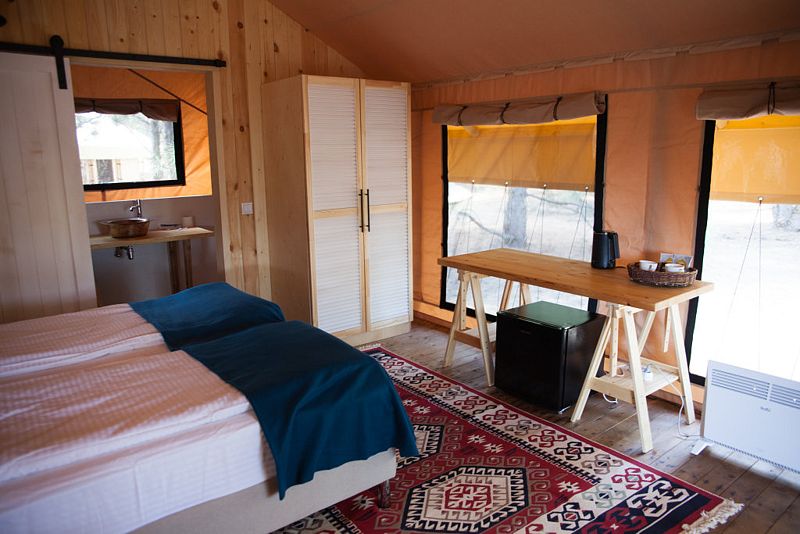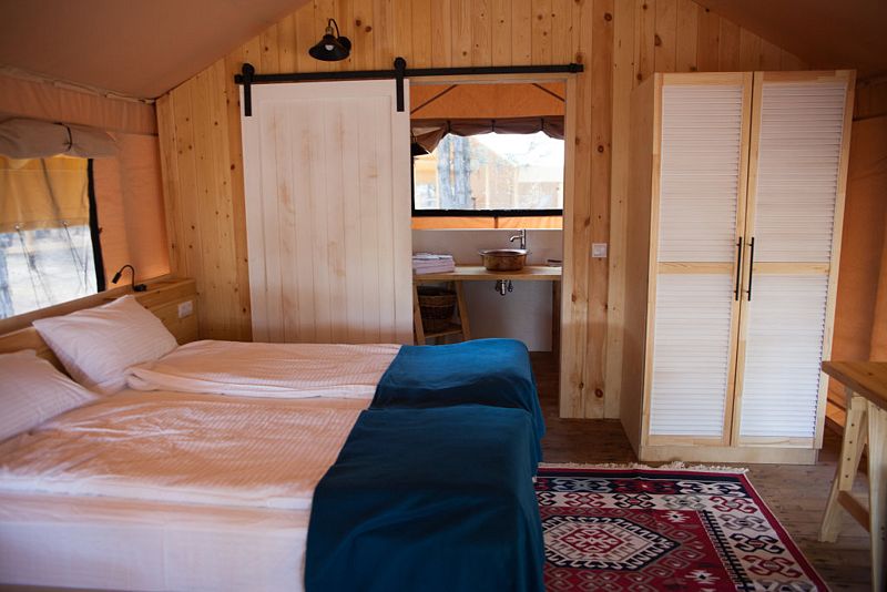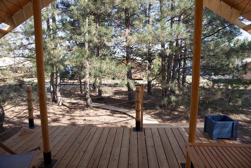 Аутентичная увеличенная сафари-палатка со всеми атрибутами первоклассного отеля внутри. Собственная терраса (закрывается прозрачным ПВХ в холодное время года — защита от ветра) с шезлонгами и столиком. На улице, рядом с тентом располагается индивидуальный бассейн — подогреваемая купель.