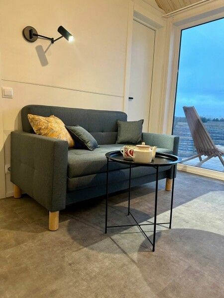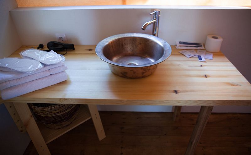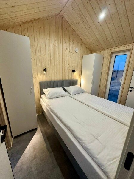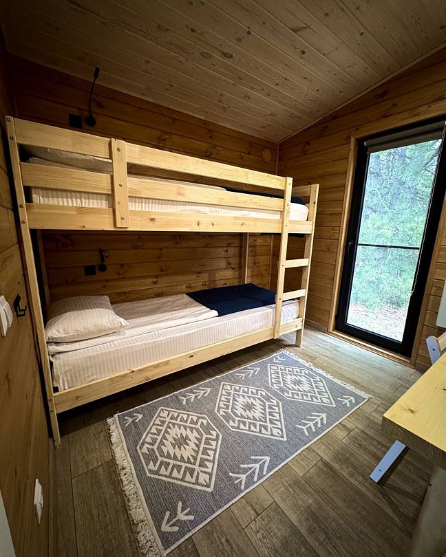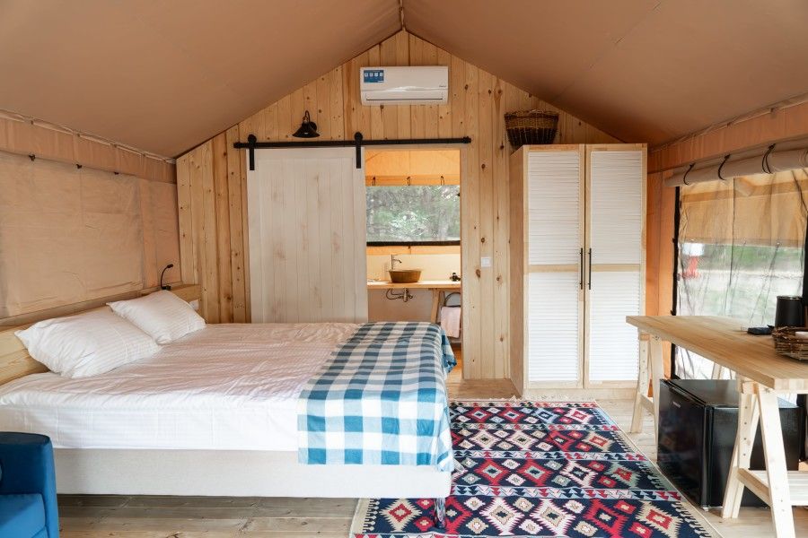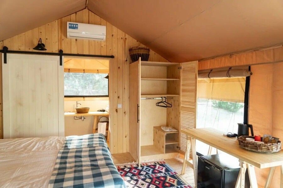 Сам домик -это большая палатка со всеми удобствами . Вначале большая терраса с столом стульями + шезлонги. в самом домике одна большая комната со всей необходимой мебелью , двухспальная кровать, диван , шкаф, стол , холодильник , чайник ,чайный набор , бутылка воды т.д. есть сплит . В ванной комнате есть душ, халаты , полотенца, зубные щетки , мыло и т.д . Все чистое , новое. Есть разные средства от комаров.