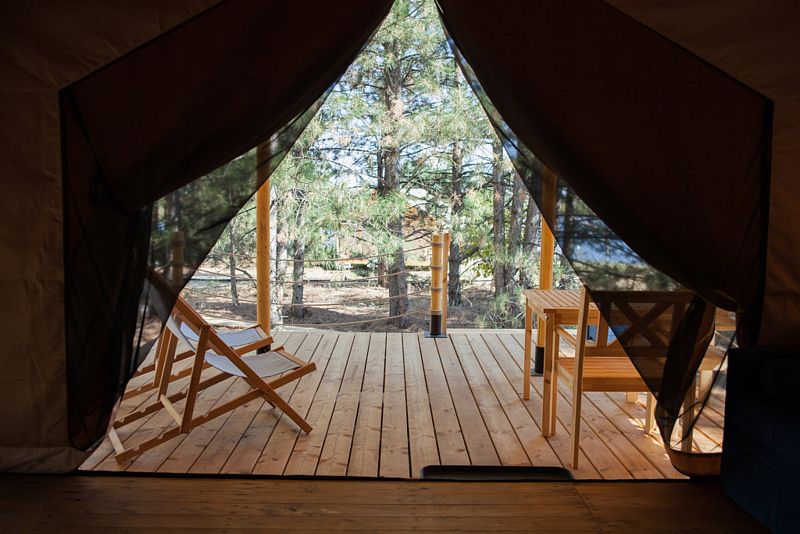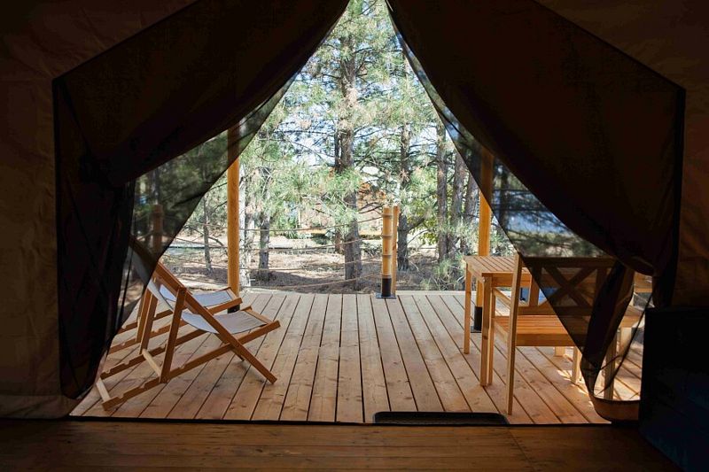 Тент-хаус с панорамным видом на сосновый лес.