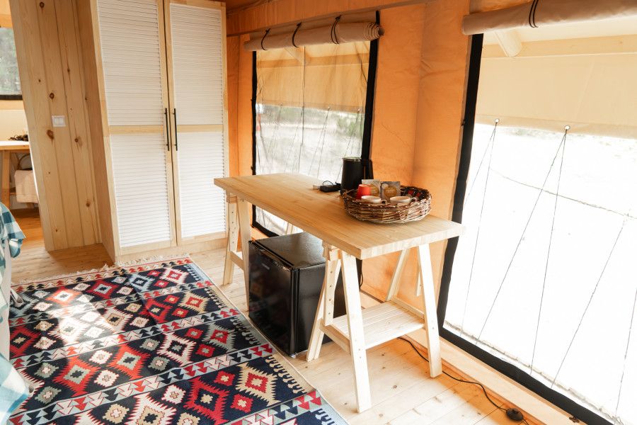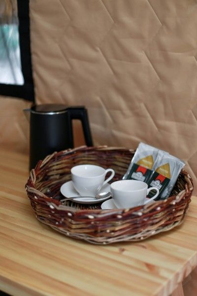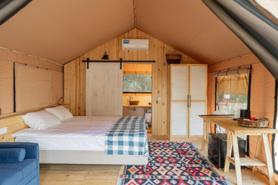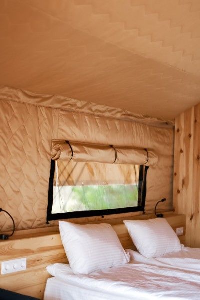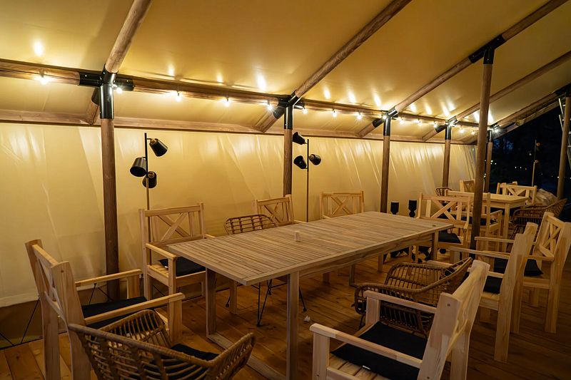 Для проживания предоставляются уютные тент-хаусы в лесу и у реки, внутри которых можно найти всё необходимое для комфортного отдыха.