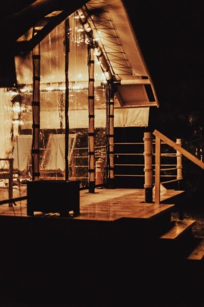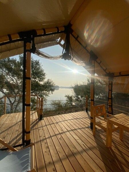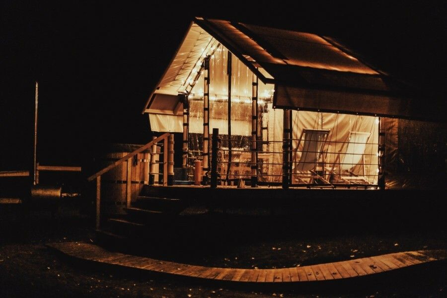 Тент-хаус с панорамным застекленным входом с видом на изгиб реки и индивидуальной горячей купелью с подсветкой.