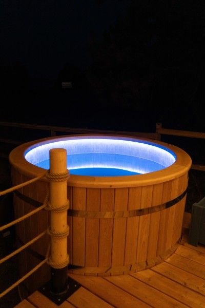 Тент-хаус с панорамным видом на сосновый лес и индивидуальной горячей купелью с подсветкой.
