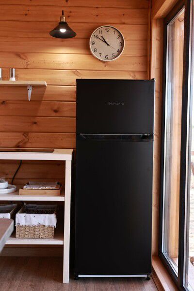 На даче есть кухонный уголок с посудой, чайником, холодильником и микроволновкой.