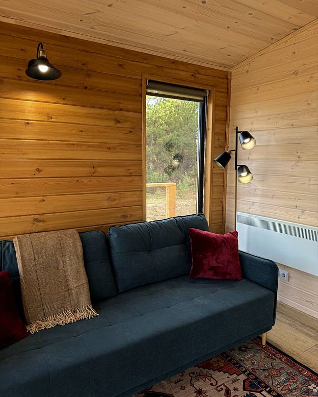 Уютный деревянный дом с двумя спальными и гостиной на опушке соснового леса с панорамными окнами и террасой, смотрящими на закат и плантацию голубики.