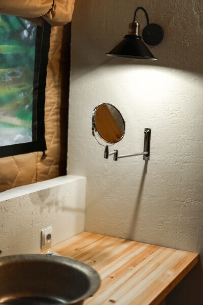 Аутентичная увеличенная сафари-палатка со всеми атрибутами первоклассного отеля внутри. Собственная терраса (закрывается прозрачным ПВХ в холодное время года - защита от ветра) с шезлонгами и столиком. На улице рядом с тентом расположен индивидуальный бассейн - подогреваемая купель.