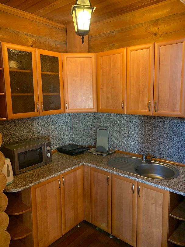 - Мини кухня, включающая в себя раковину, СВЧ печь, электрический чайник, холодильник, посуда и столовые приборы, стол и стулья;