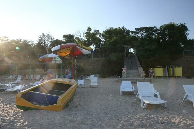 Можно отдохнуть в беседке, на террасе, прогуляться по аллеям. К морю ведет лестница. Территория базы отдыха Рожок чистая, ухоженная. Везде клумбы, цветы. На море открывается потрясающий вид, здесь всегда красивые закаты.